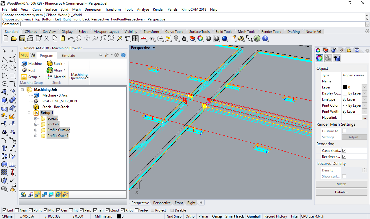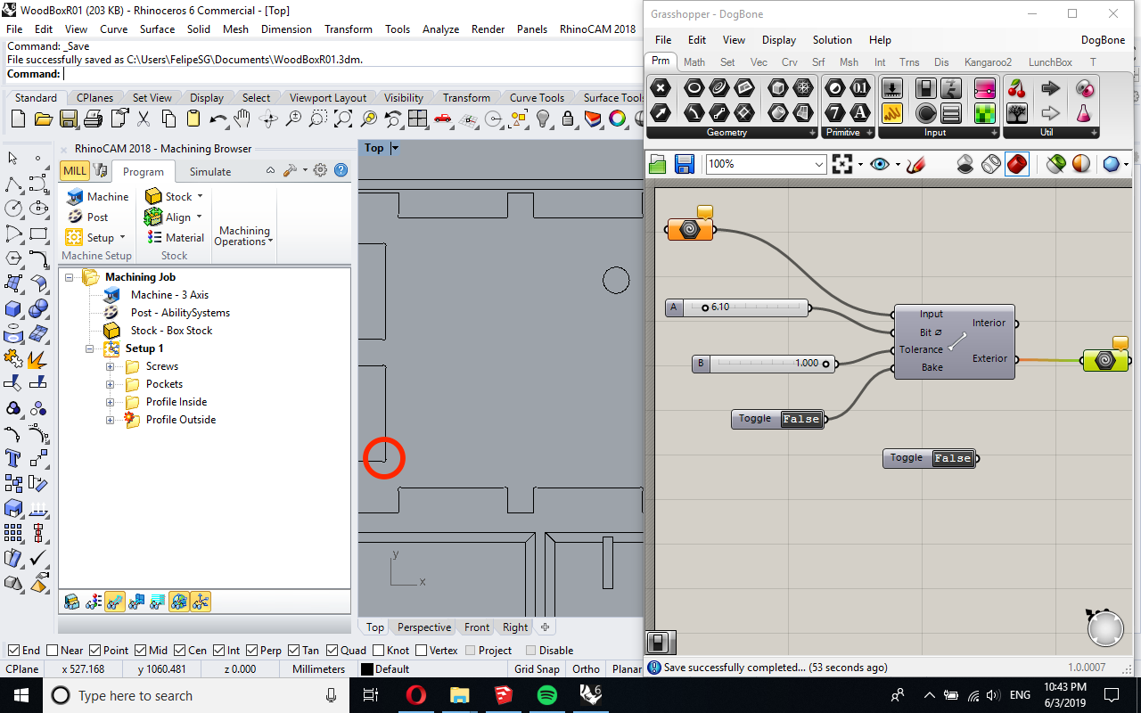 - Profiles: This was used only to make the circular hole to pass cables inside the cube and follows the same rules from the pockets but with 2 passes of 6mm and 2 passes of 1.4mm to cut through.