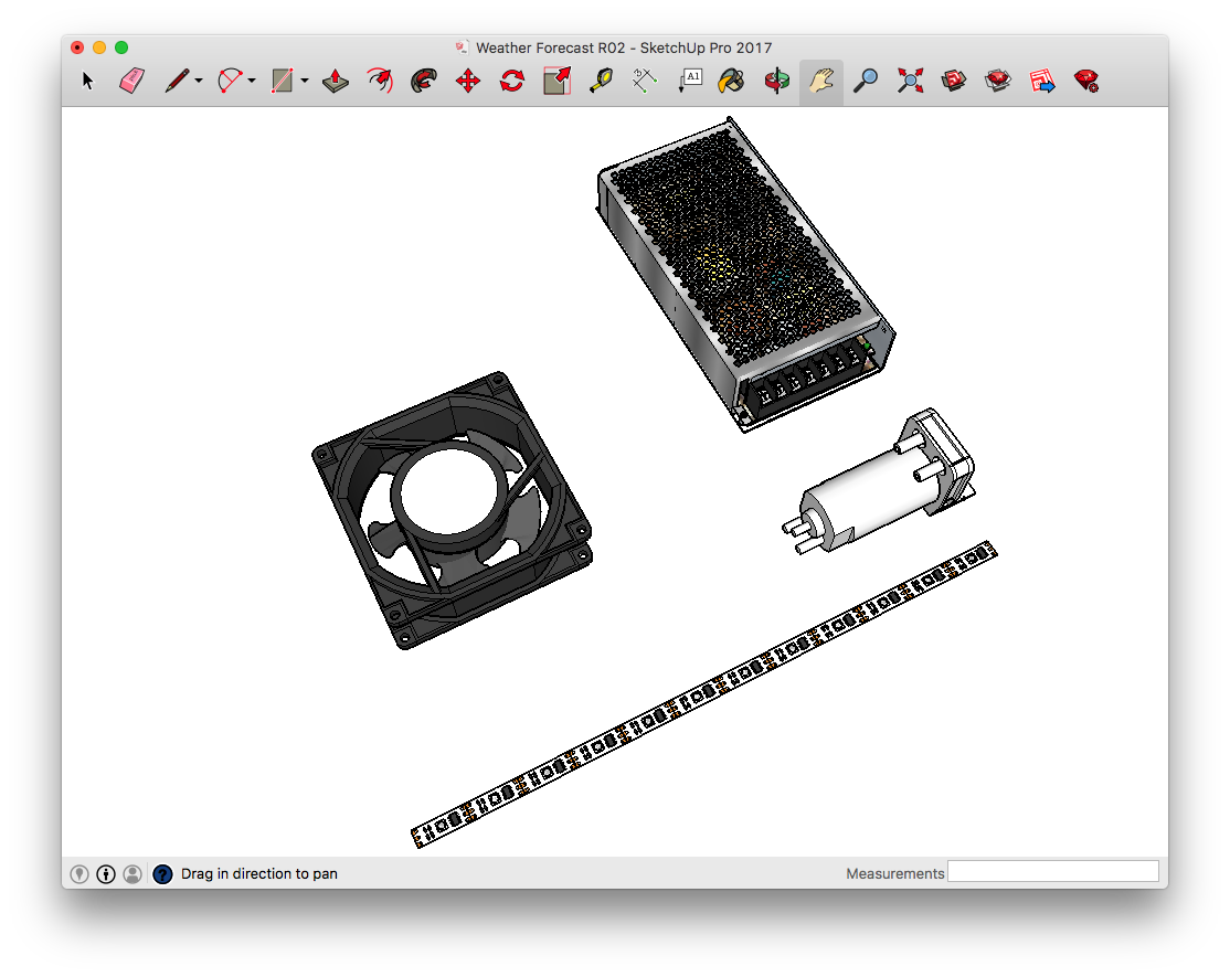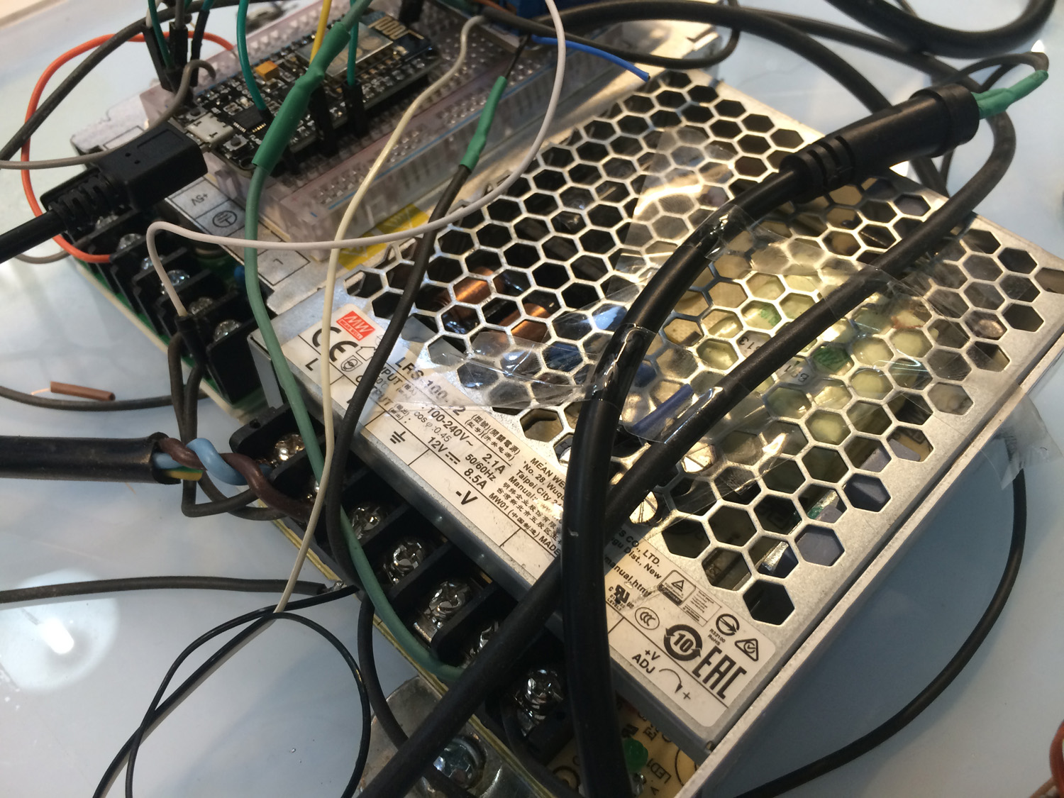 I used a 5v 10a power supply to power the LED strip and a 12v 8.5a to power the pump, the fan and the mist maker. They are daisy chained in the AC lines to use only one power cable.