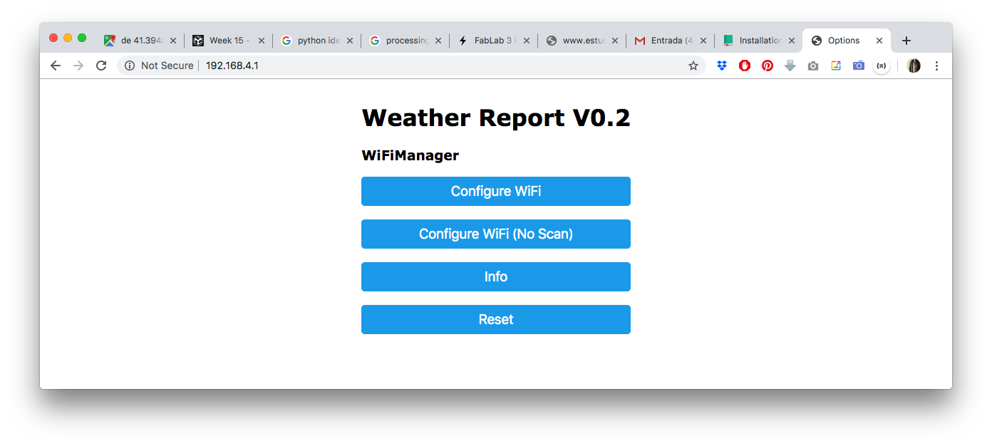 1) You go to a web interface (from your favorite browser) that is only accessible in the local network (the address will always be informed physically in the installation), in the case of the tests I used a fixed address of 192.168.2.222. The web interface is generated by the ESP8266.