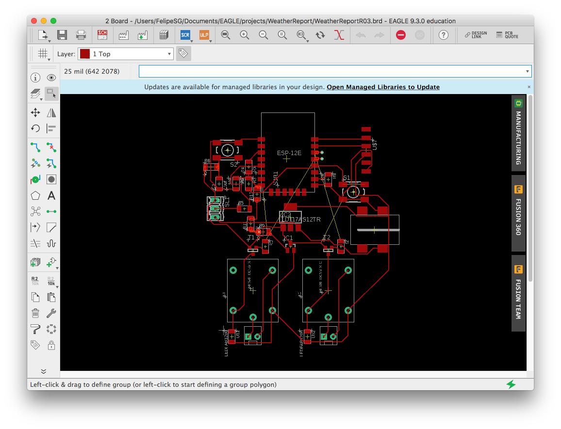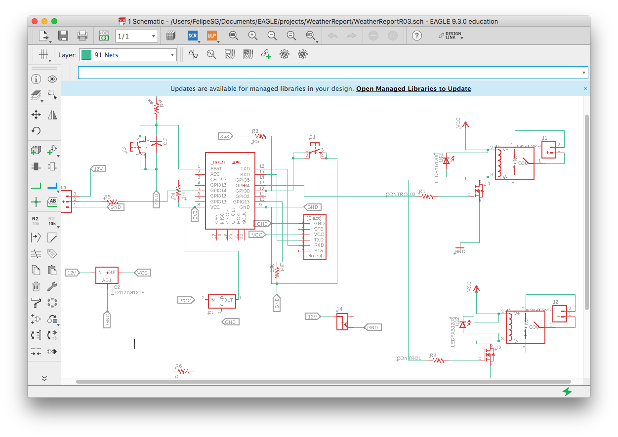 I designed this board in EAGLE from scratch following some guide lines from the Arduino ESP8266 Docs, mainly the Improved stability part. Some buttons and resistors are required to program and to run codes in the ESP8266.