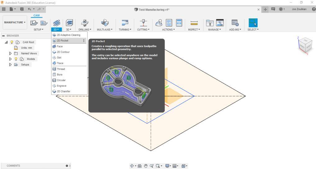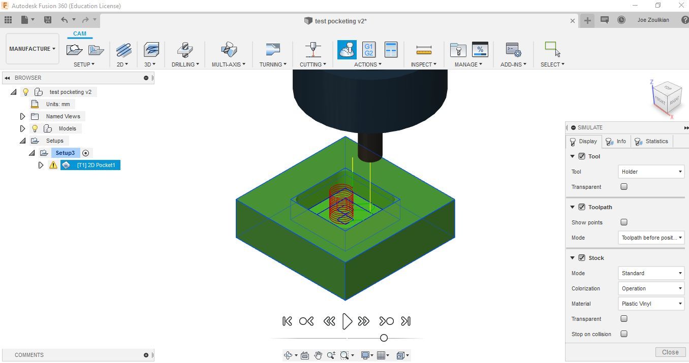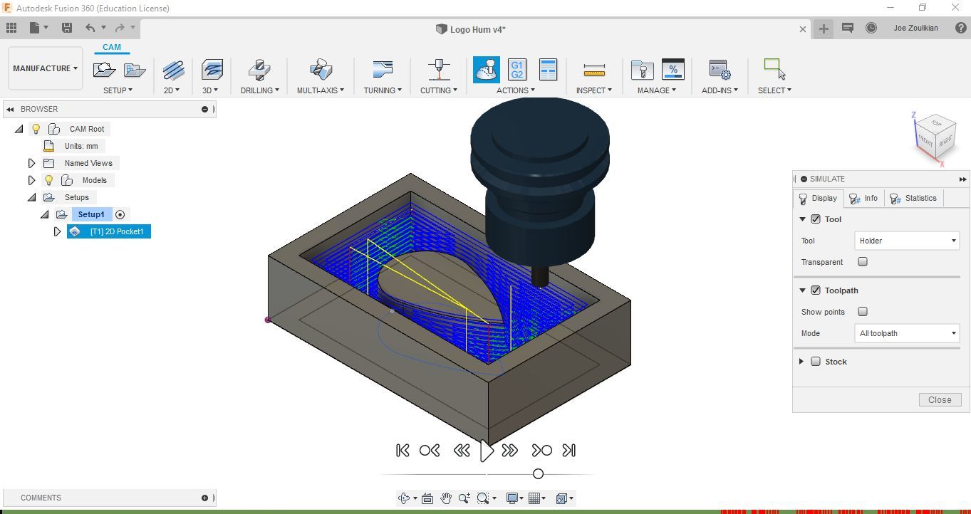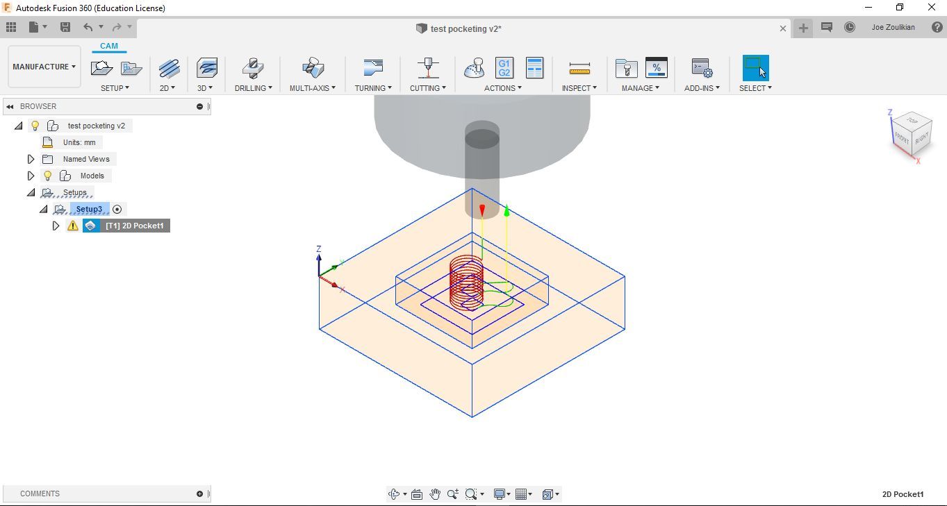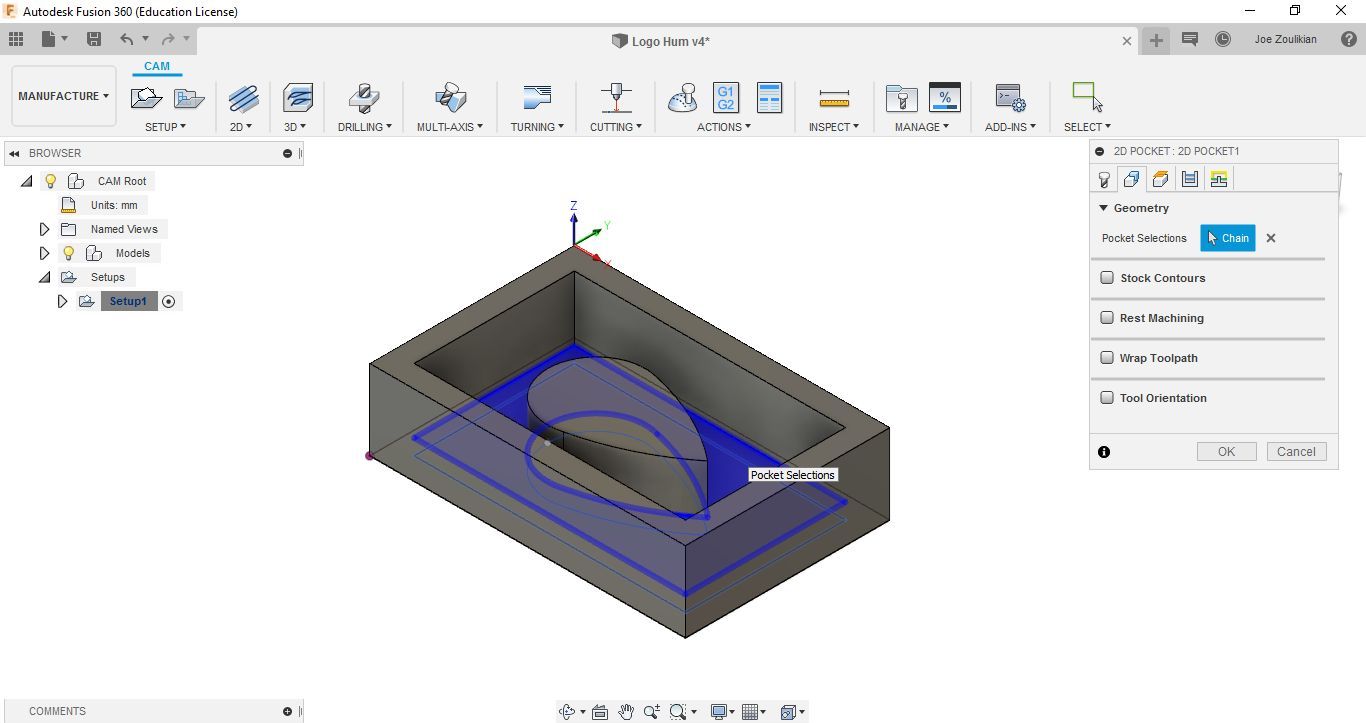 In Geometry: I selected the pocket contour to be machined. Then I hit ok to visualize the primary tool path.