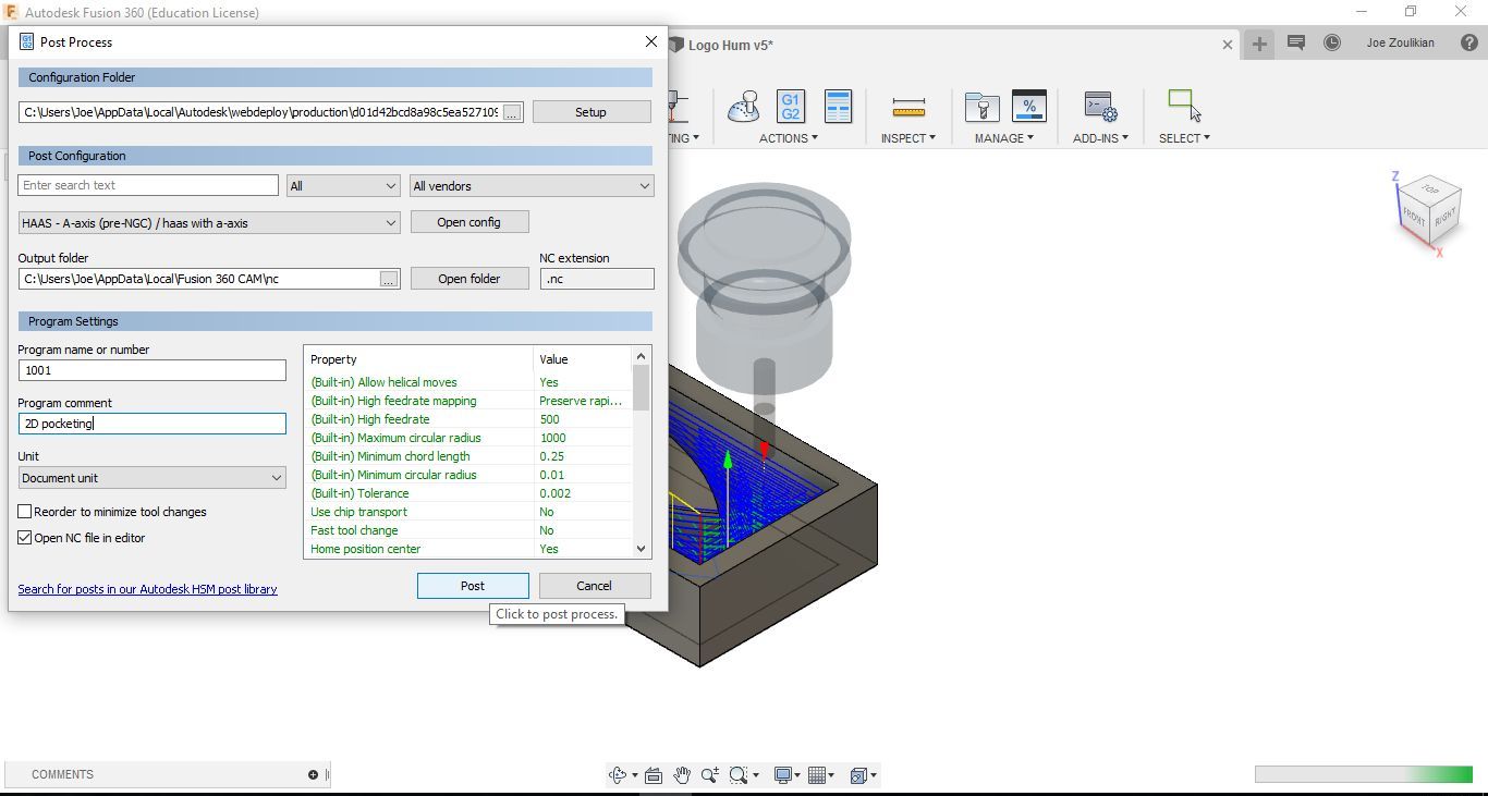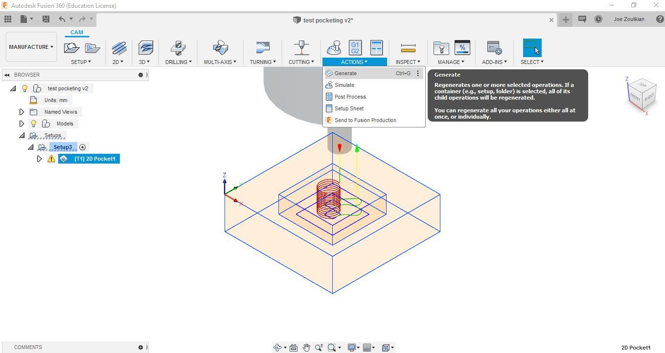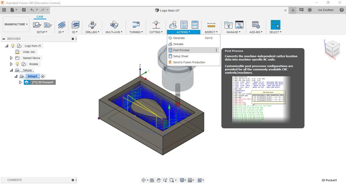 I selected "Actions" then "Post Process" to Generate the G and M Codes.