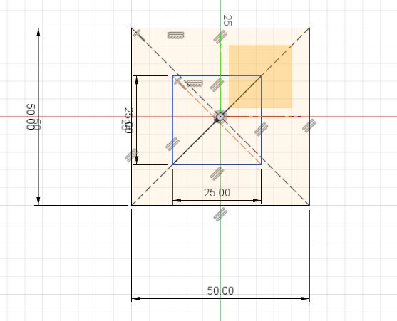I started to draw a 50 x 50 mm square, and inside it another square of 25 x 25 mm. Then I used the 2D pocket function to remove the material of inside the small square by using an 8mm Flat End Mill.