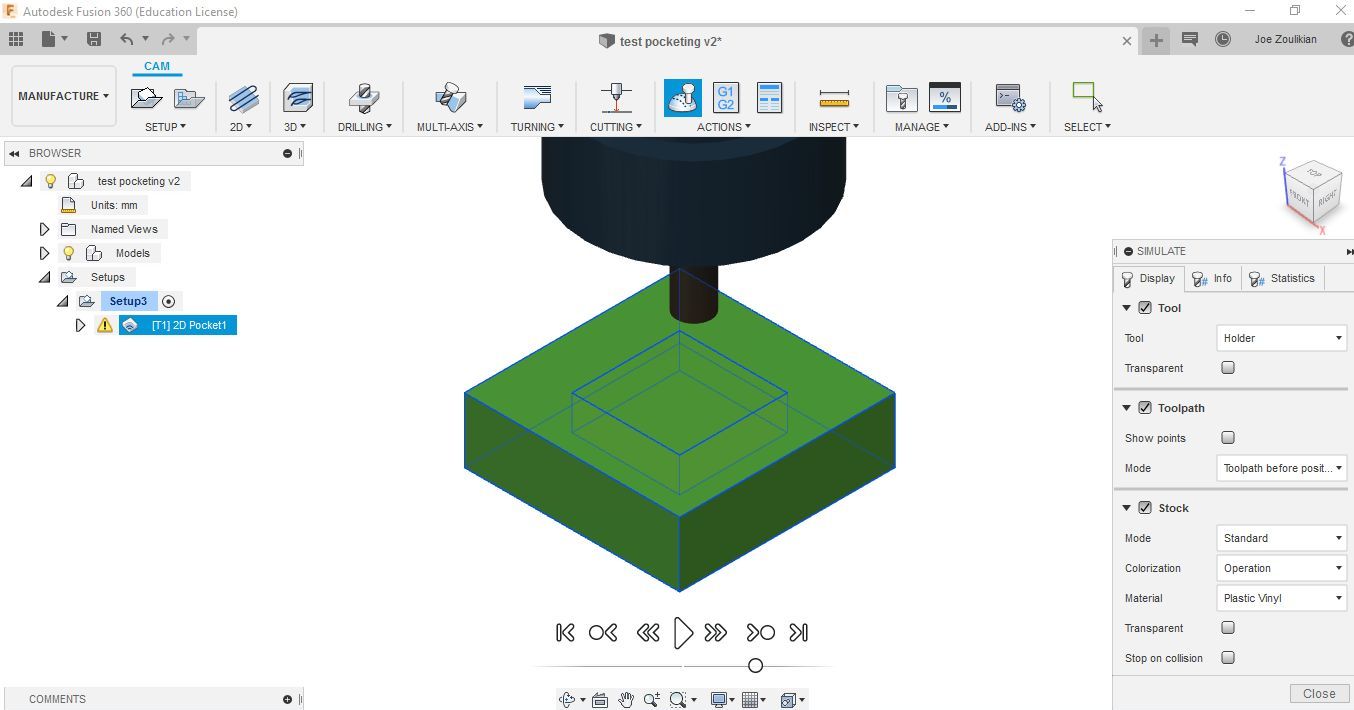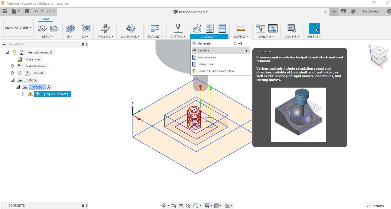 I used Actions "Generate" to visualize the toolpath, then Actions "Simulate" to run a simulation of the machining process.