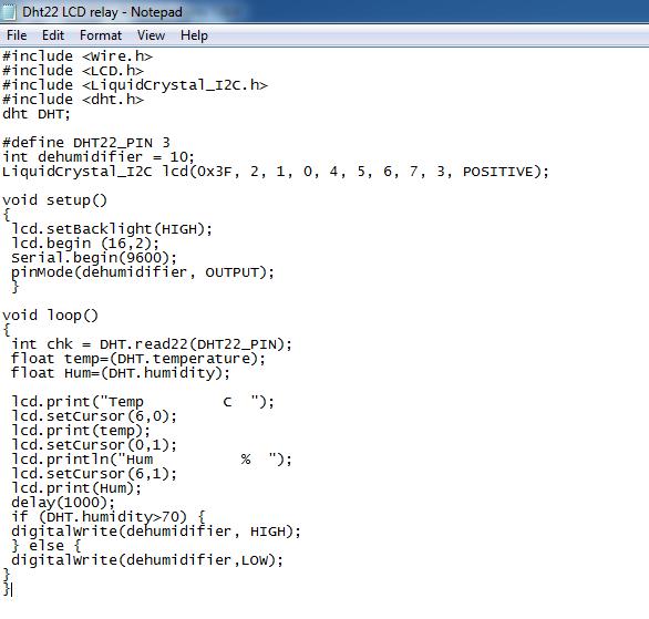 The Arduino code to read the Dht-22 sensor and display the Humidity and Temperature values on the LCD and turn On/Off the relay.