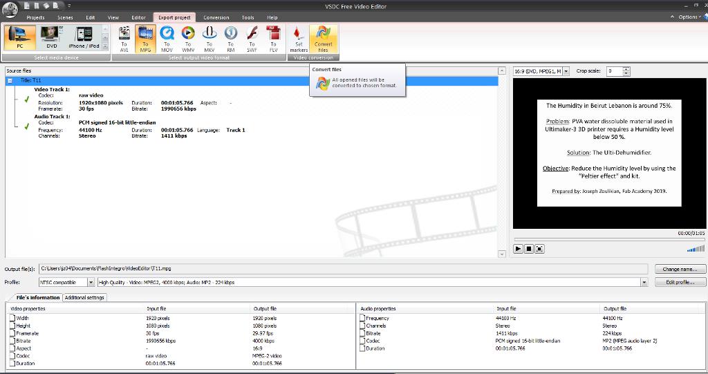 After that I exported and converted the file from .vproj to .avi. The final conversion from .avi to .mp4 was done using the online software cloudconvert to convert my video to .mp4. I also used ps2pdf to compress the size.