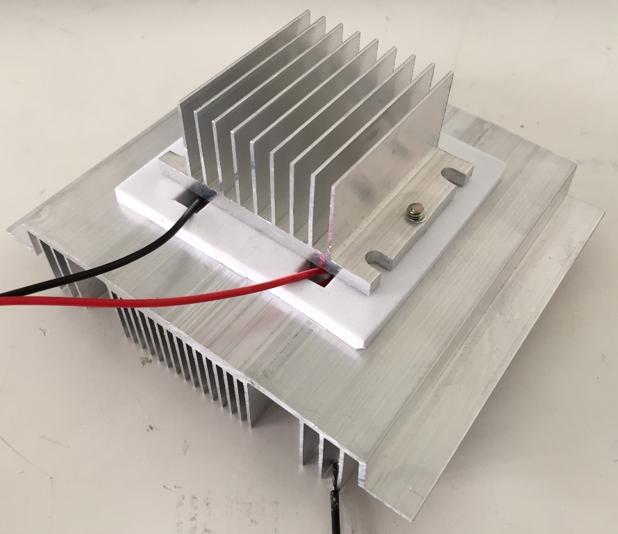 Keep in mind that the same air is still being pulled into the back of the dehumidifier. The air essentially travels around this front cold side heat sink and the whole Peltier module/ heat sink assembly to the back of the dehumidifier. Here the air is pulled past the hot side heat sink. The air exhausts out of the dehumidifier as warmer (because of the hot side heat sink) dryer (because of the cold side heat sink) air.