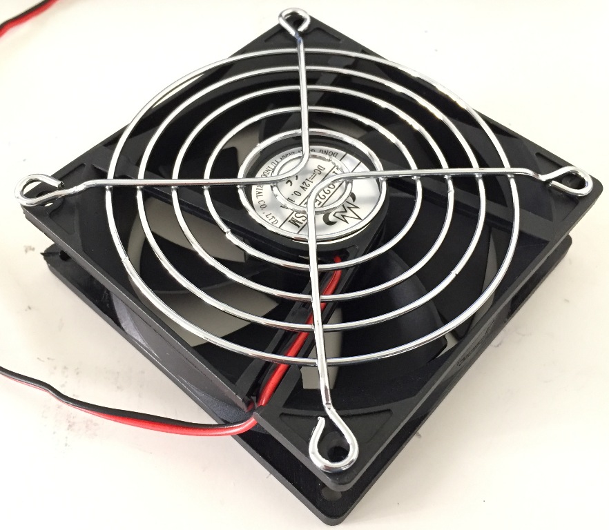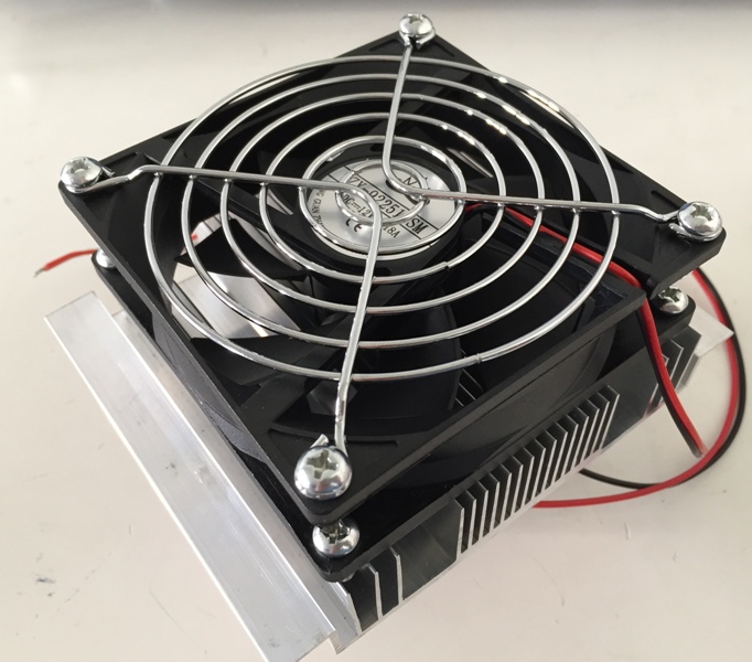 The Peltier module is sandwiched between the two heat sinks. One side of the Peltier module gets cold and the other side gets hot when electricity is run through it. The cold side of the module is in direct contact with one heat sink. The hot side of the module is in direct contact with the other heat sink. The cold side heat sink is on the side of the dehumidifier where warm humid air enters the front of the dehumidifier. The hot side heat sink is on the back side of the dehumidifier. Behind the hot side heat sink is the small brushless fan that pulls air through the whole assembly.