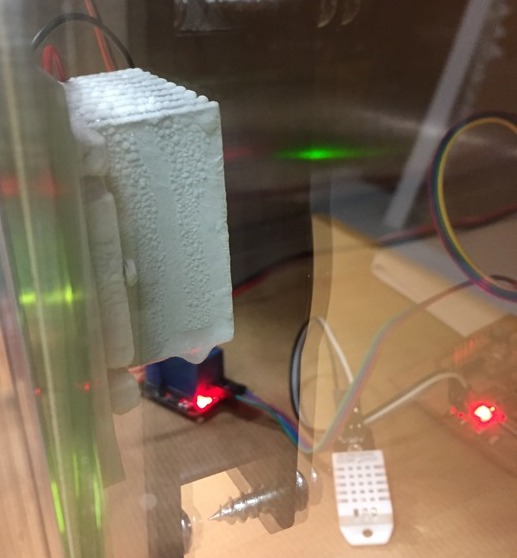 I checked the operation, as you can see I need to arrange the wires and fix the DHT-22, the Relay and the door. I added an On/Off switch and a power supply outlet easy to remove and having one way of connection to avoid polarity problems.