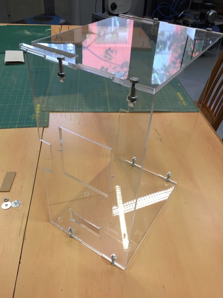 I redesigned and cutted the covers of the Dehumidifier box using 6mm Acrylic and the T-Slot technic that was very useful and easy to assemble and dismantle the box.