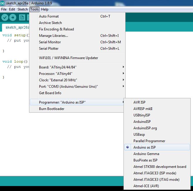 Then set the programmer "Arduino as ISP".