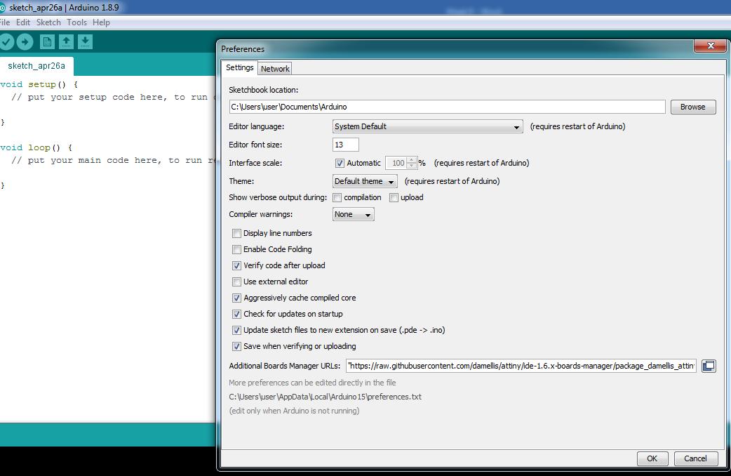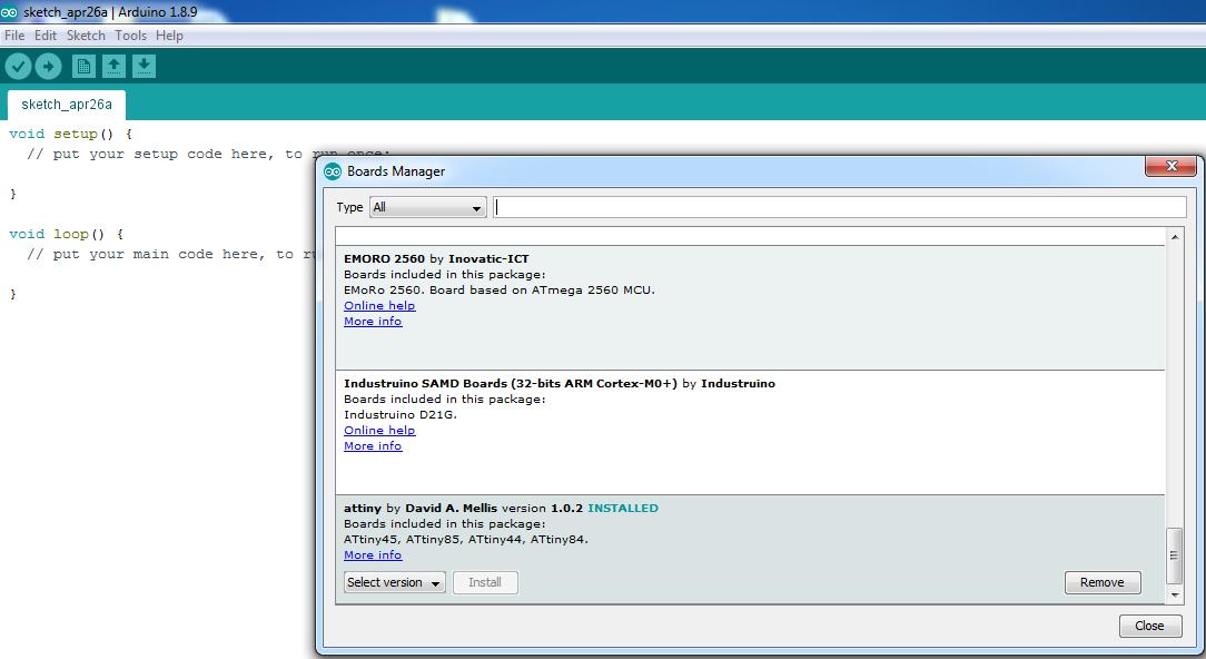 I installed Attiny44 board on the Arduino IDE. To do that I go to settings and insert this link: "https://raw.githubusercontent.com/damellis/attiny/ide-1.6.x-boards-manager/package_damellis_attiny_index.json".