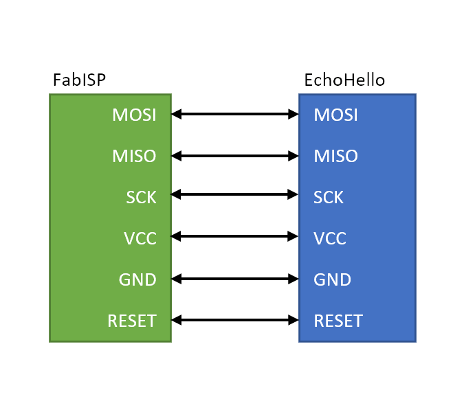 The connection between my "FabISP" and my "Hello Board" will be as follows: each Pin on a board is connected to it's similar on the other board.