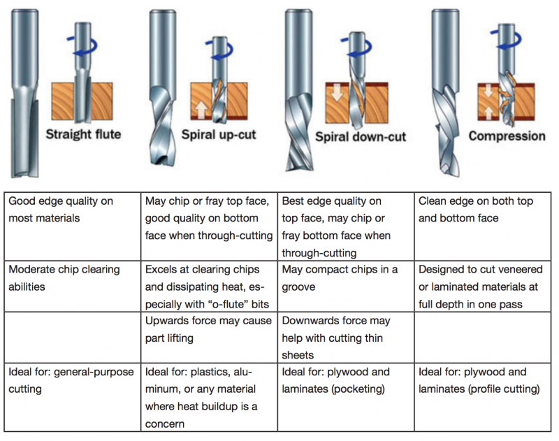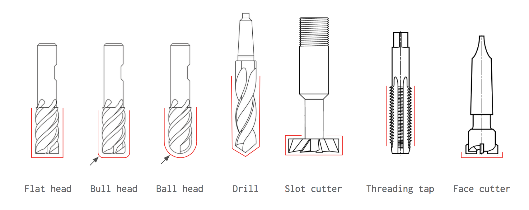 Below are the types of CNC Bits available and you can use one accoring to the end result you wish to achieve. The red line shows the section of the cut you will get using that tool.