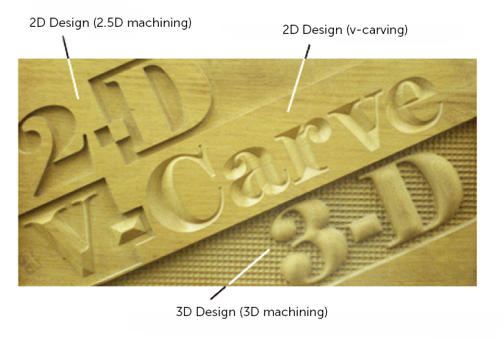 If we then added straight up and down movements of the cutter into and out of the material, we might now consider the project as 2.5D,cut features like grooves or flat pockets,where you are pocketing areas (e.g. around letters in a sign)All such cutting can be done in one or more different cutting planes after plunging to a cutting dept, V-carving as a 2.5D design process.