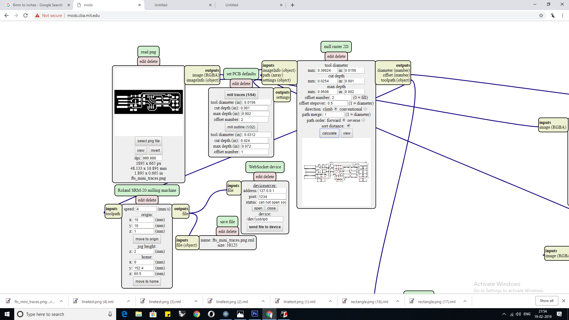 First I created an .rml file of the board traces using mods and then uploaded it into a software called V-Panel, once added i then ran the machine without loading neither the bit nor the board in the air just to verify if everything was running smoothly here, i noticed that there no way to track the progress. For that my instructor suggested me to try Modela Virtual.