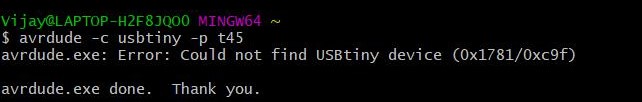 avrdude -c usbtiny -p t45 avrdude.exe: Error: Could not find USBtiny device (0x1781/0xc9f)
