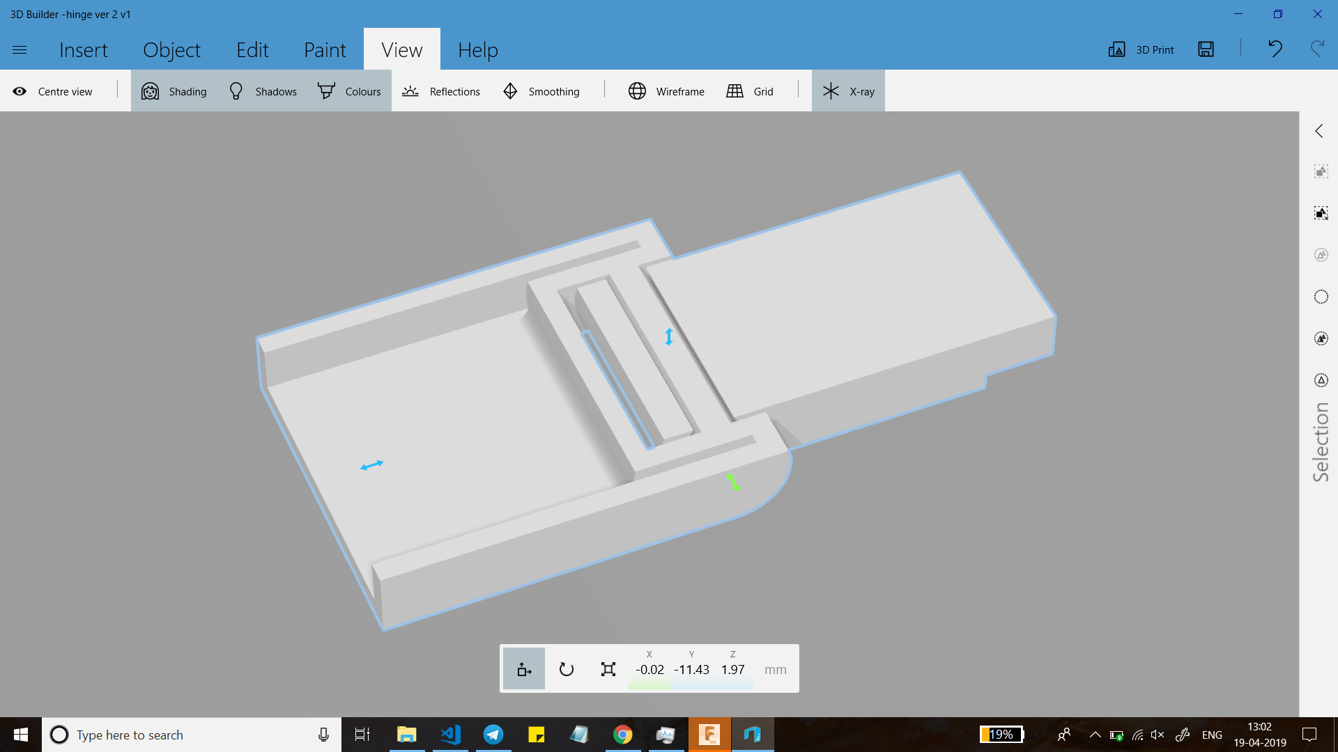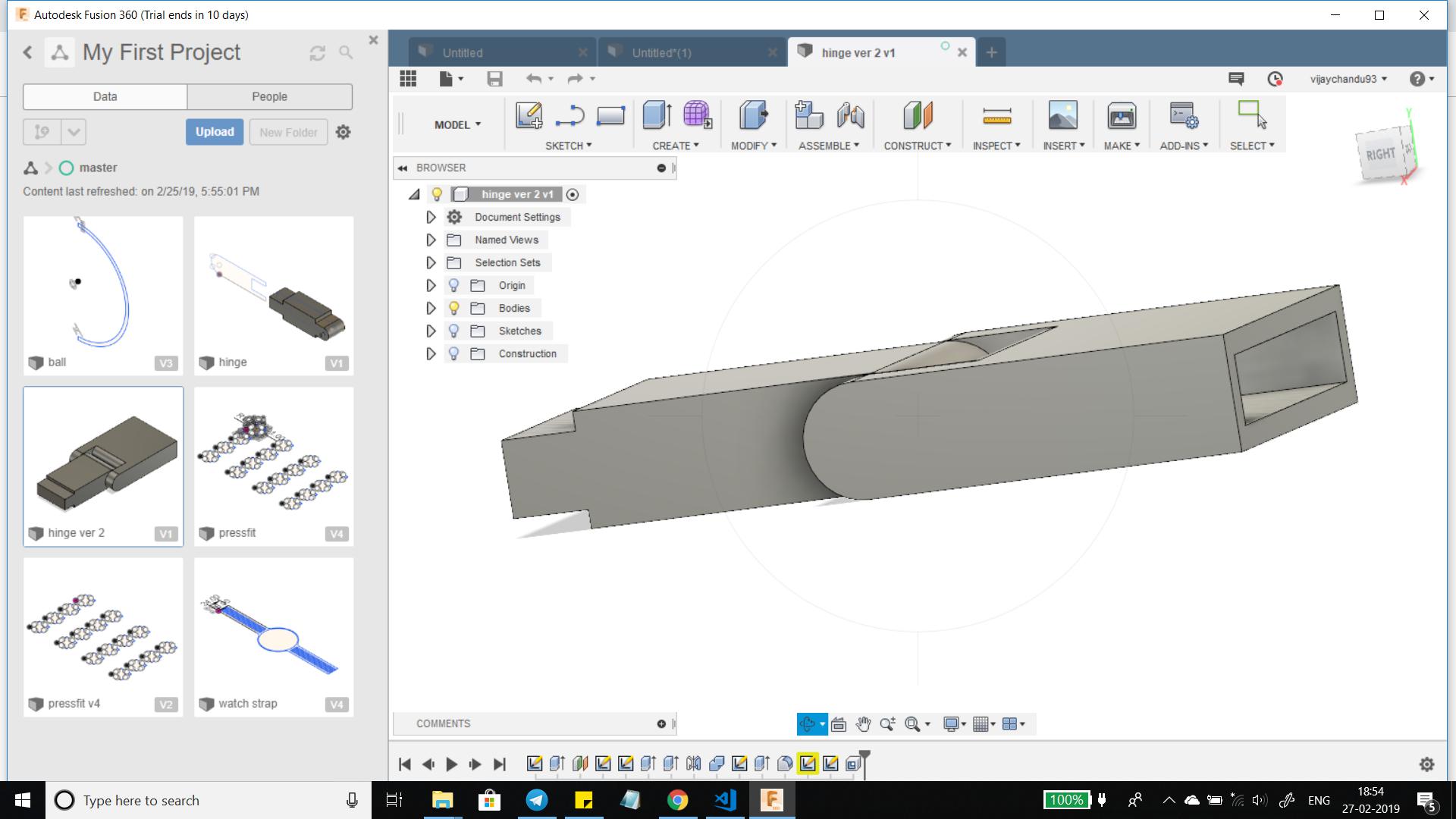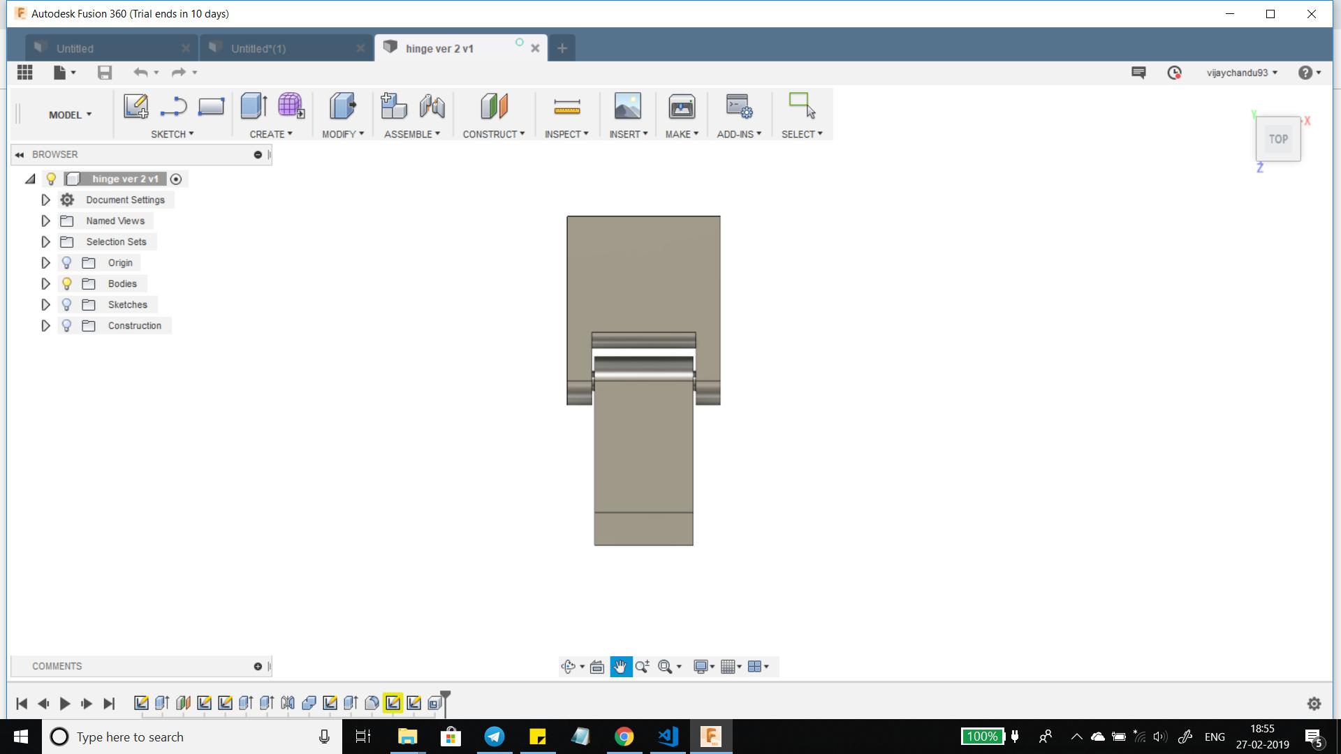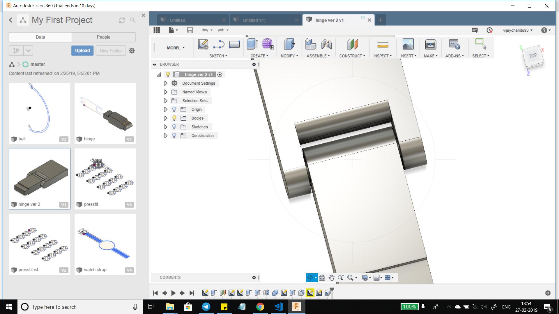 For the CAD Software I used Fusion 360, it took some time to design the hinge but it was challenging when I tried to design the female part of the link because i tried to use the shell command and it would create a rectangular hole (like a slot) with fixed offset.