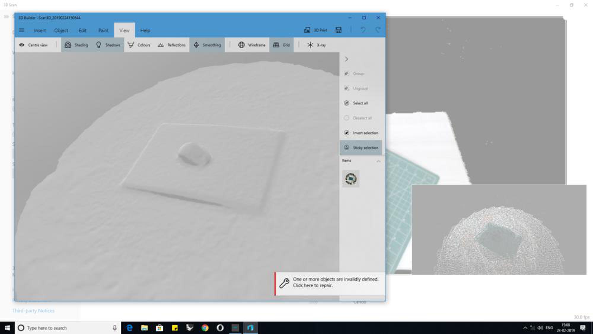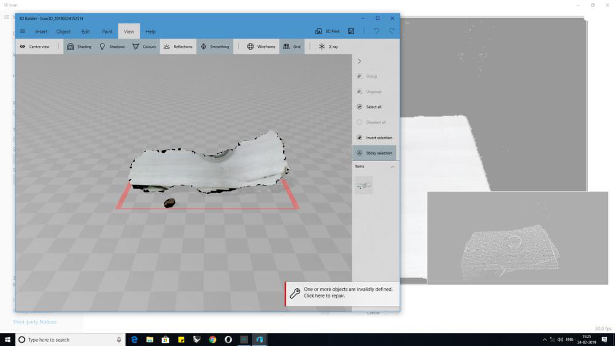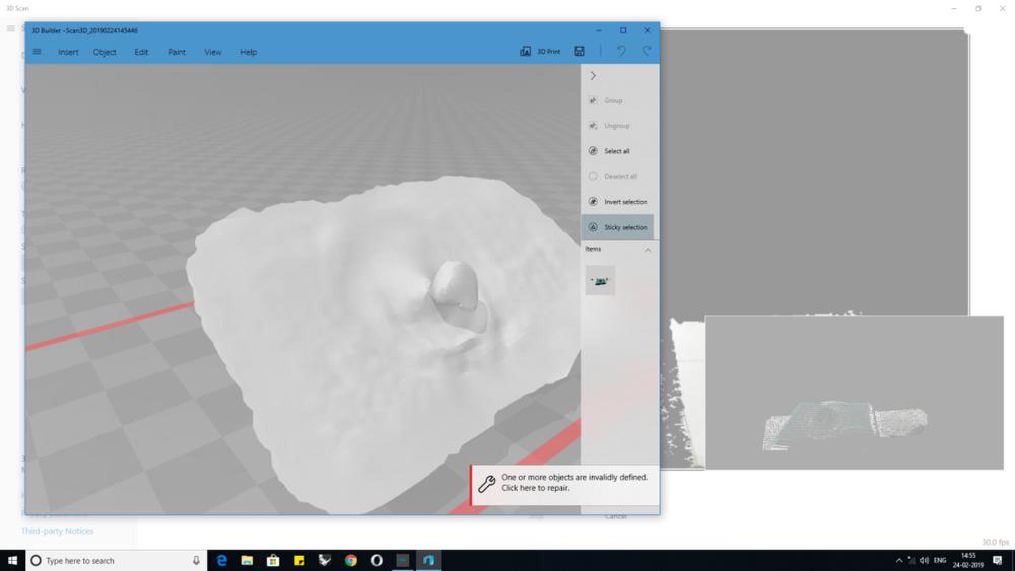 During my research I have found that compared to the skanect software 3D scan app has two advantages one is that it was developed by microsoft and has integrated its other softwares like 3d Builder to create a good scan and use Print 3D App to print the the scan, but I will be using Meshmixer to smoothen my scan surface and used the inspect tool to check for errors.