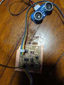 So look at the thing above from the link. It sends out a signal sonically, then hears it back and figures out the time between sending out the signal and receiving it back. This works because sound bounces off of stuff - review basic physics for more info. Since we know the speed of sound, we can figure out how far something away based on the time to receive stuff since that is how solving equations works. If you look at the datasheet for the thing, it needs power, a ground, and 2 digital pins - one for the trigger and one for the echo. Cool. Inspired by the design inspired by the lecture, I adjusted it to use an ATtiny44 instead so we could add other stuff like motors or buttons or cappuccino machines.