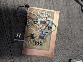 On the slave side, there was a slight issue with solder connecting a couple of traces underneath the microcontroller, thus cutting the VCC above it and the wire connecting the ISP connection to the microcontroller. I put everything on the board for a thermocouple signal to be amplified (K type is around 40 μV/℃, so it requires a roughly 500 times signal multiplier, thus the 500 and 1 kΩ resistances in their respective positions on the op amp (series - add resistances). The thermistor is there to measure the ambient temperature to act as the cold junction compensation. I will be sending over the temperature to the display, as well as to the serial monitor.