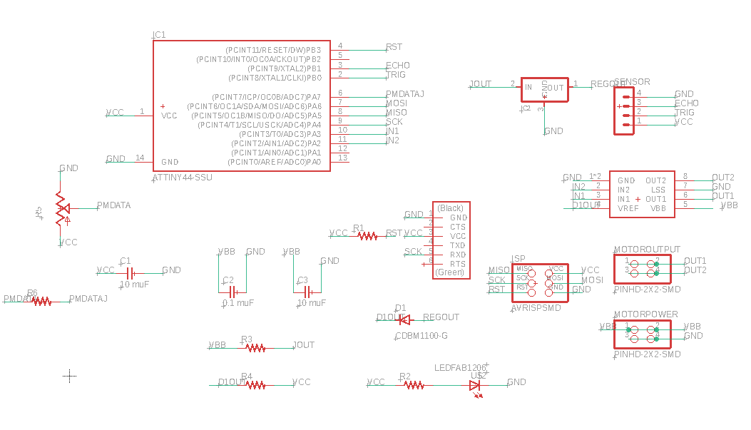 First, I wanted to use a Hall magnetic field sensor to trigger the conveyor, since that is what others in the group were thinking to use. But the distance/motion sensor makes more sense for a stand alone conveyor belt. So the board and schematic originally used: