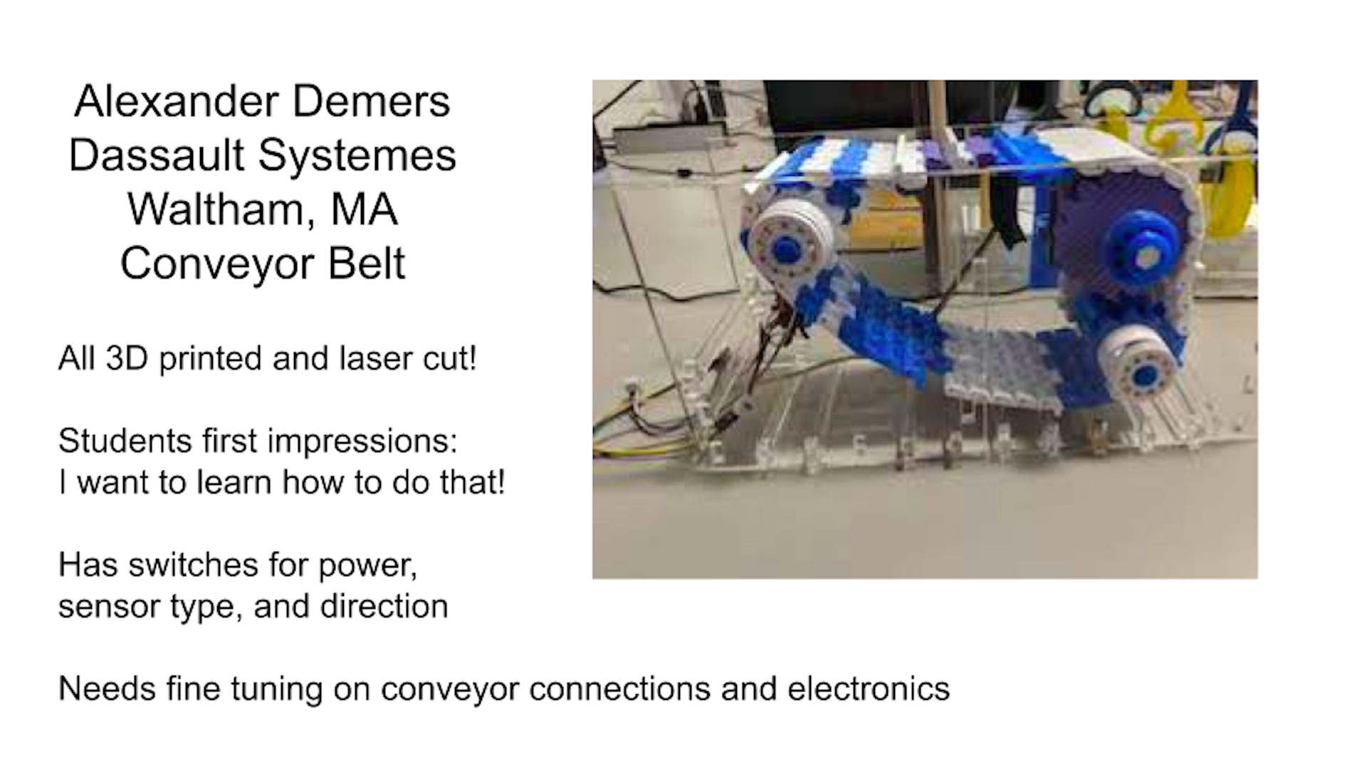With this project, I think it is most useful to show what can be made in a lab. I have already have students express interest in learning how to make something like this conveyor system, given how impressive it looks!