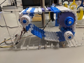 Moving forward, I would like to fix the sprocket so that it does not skip, as well as slow down the motor speed. I did try to use a 9 V battery with the system, but unfortunately it does not put out enough voltage due to the internal resistance, so finding a good battery system would be great. I would also like to further work to compress the electronics into the system. Also, work on the firmness of the connections between adjacent frame pieces, so I can get rid of the chip clips.