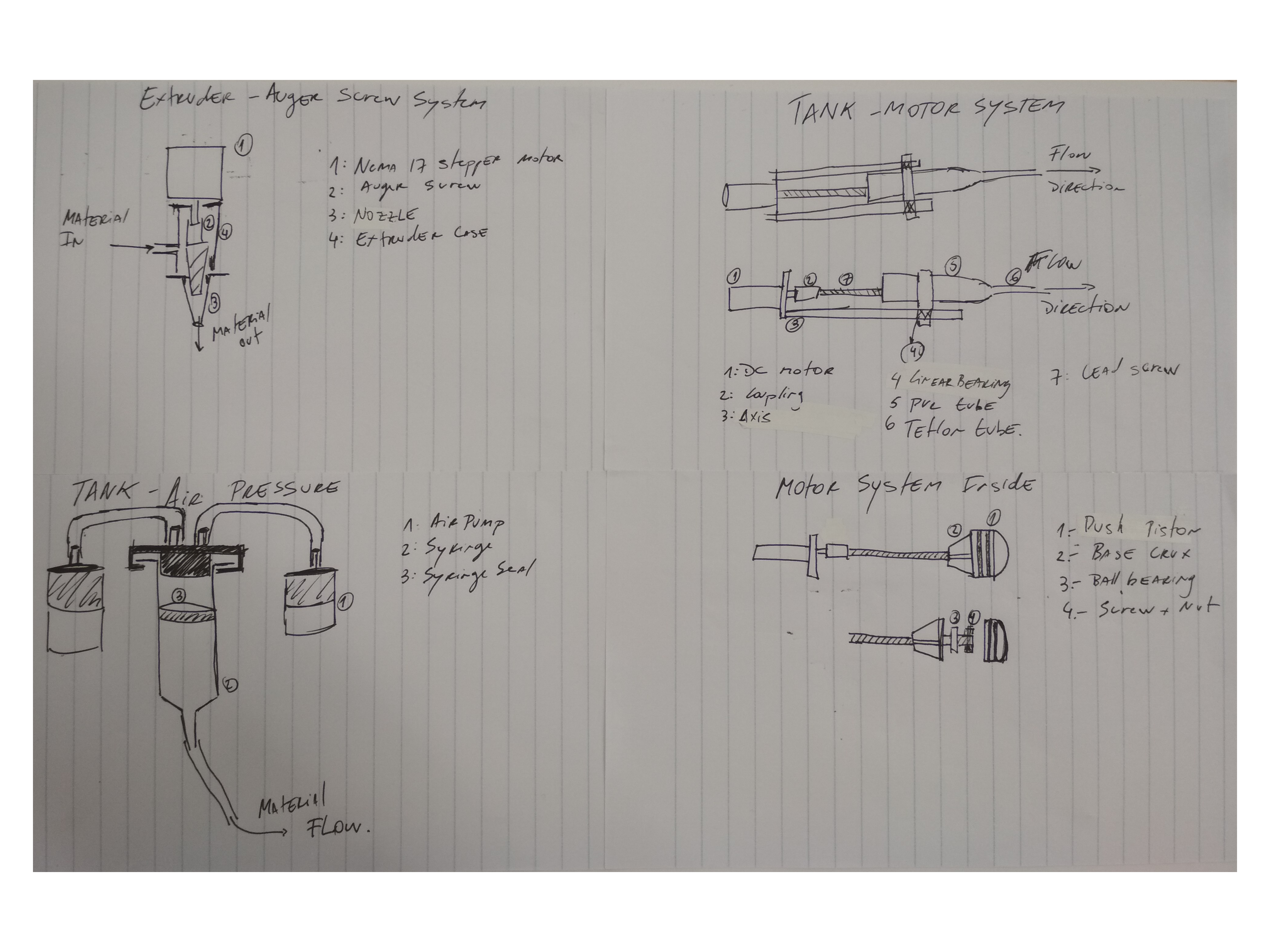 The system is divided in 2 subsystems; the tank and the extruder. The first one is the tank; where the material is acumulated, and pushed through mechanical energy to the extruder. The extruder is the second subsystem, the material flow from the tank enters the extruder, the extruder uses a Stepper Motor and a Auger Screw to extrude when the G-Code send it.