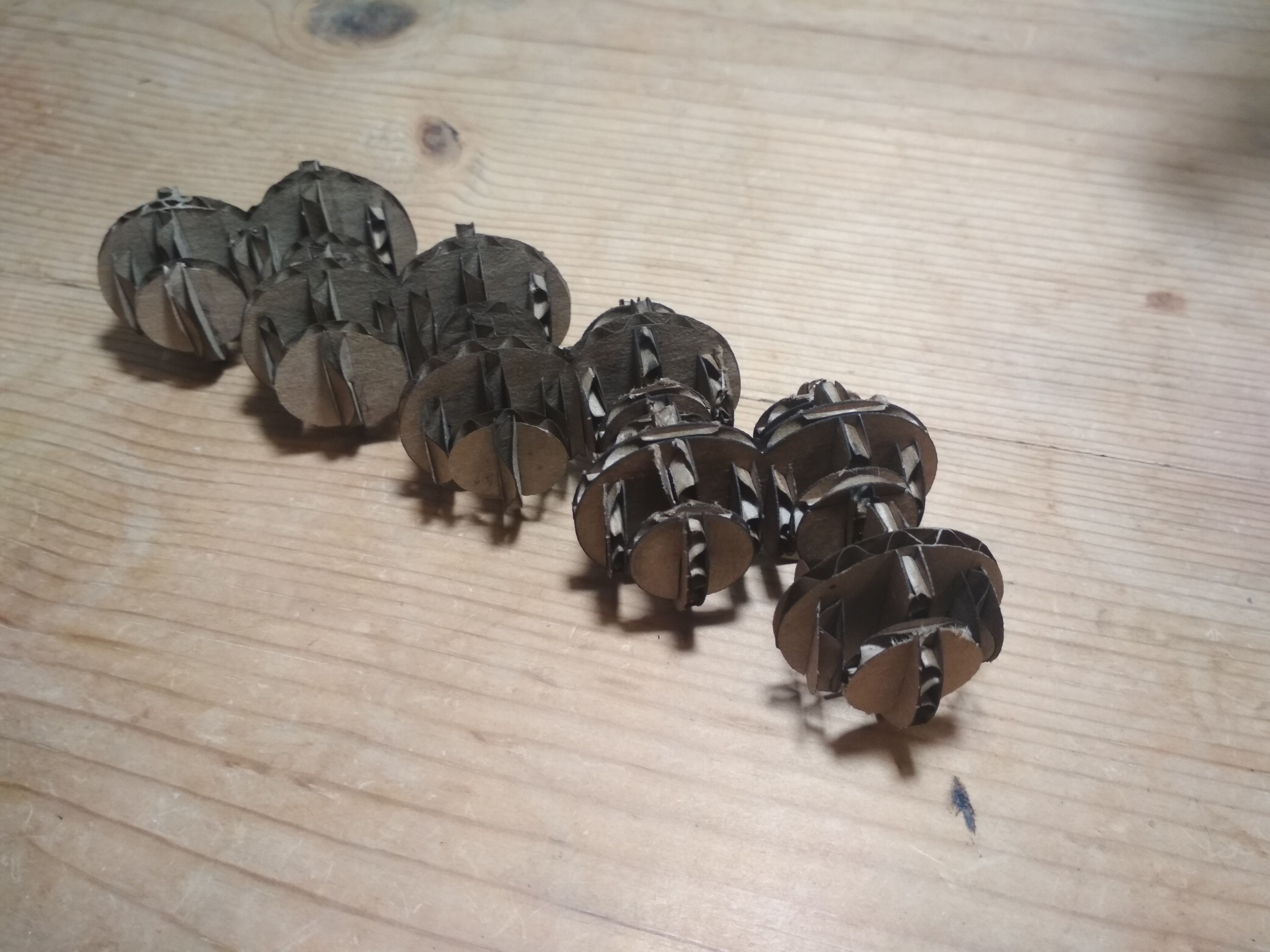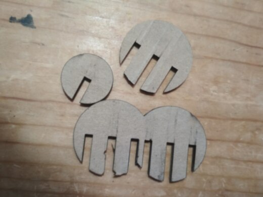 This parts where designed usign Grasshopper, and the idea came from the decontruction of a sphere using the code posted before. Here you can download the code for the Press-Fit Spheres, where you can modify the diferent parts radius, material thikness and kerf.
