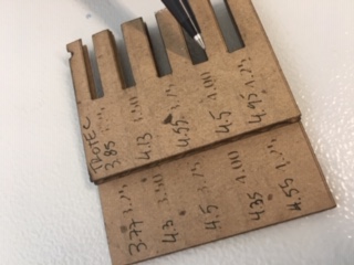The idea was to make a 2 sloted boards with a small variation in every slot length, incrementing from 3.25 - 4.25 [mm]. After they were cutted we measured every slot real size to determine the machines kerf.