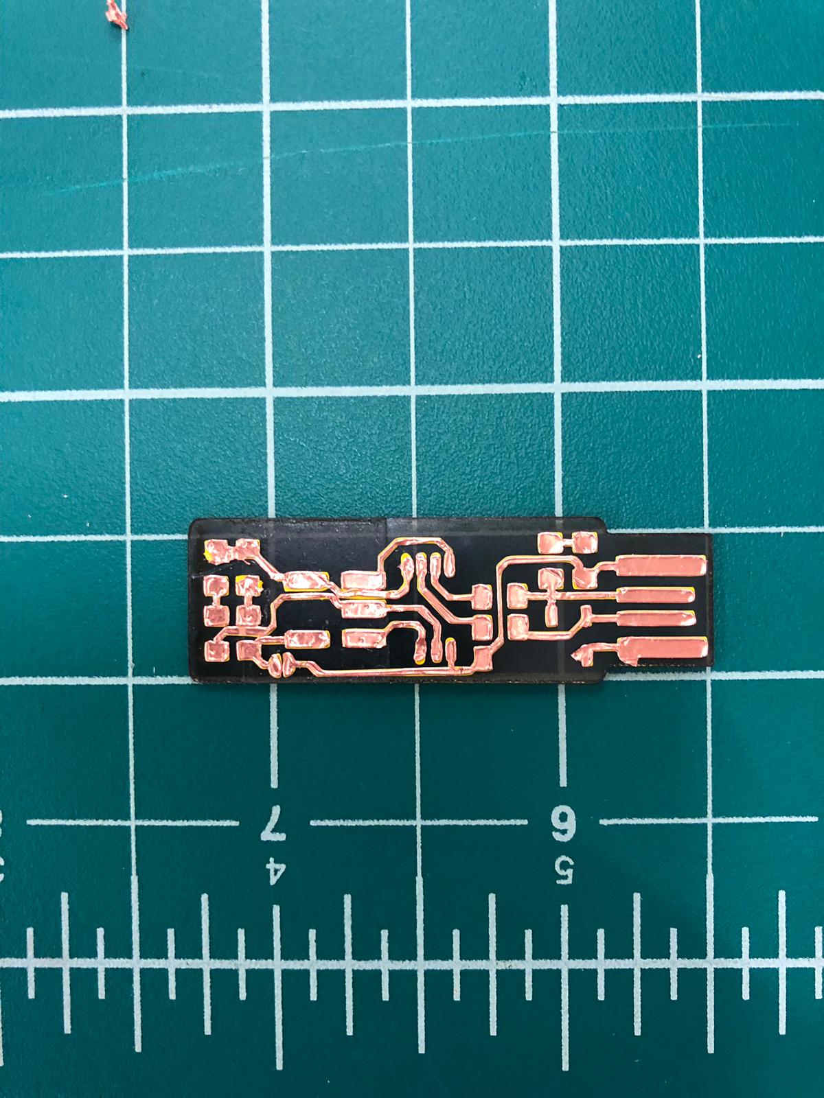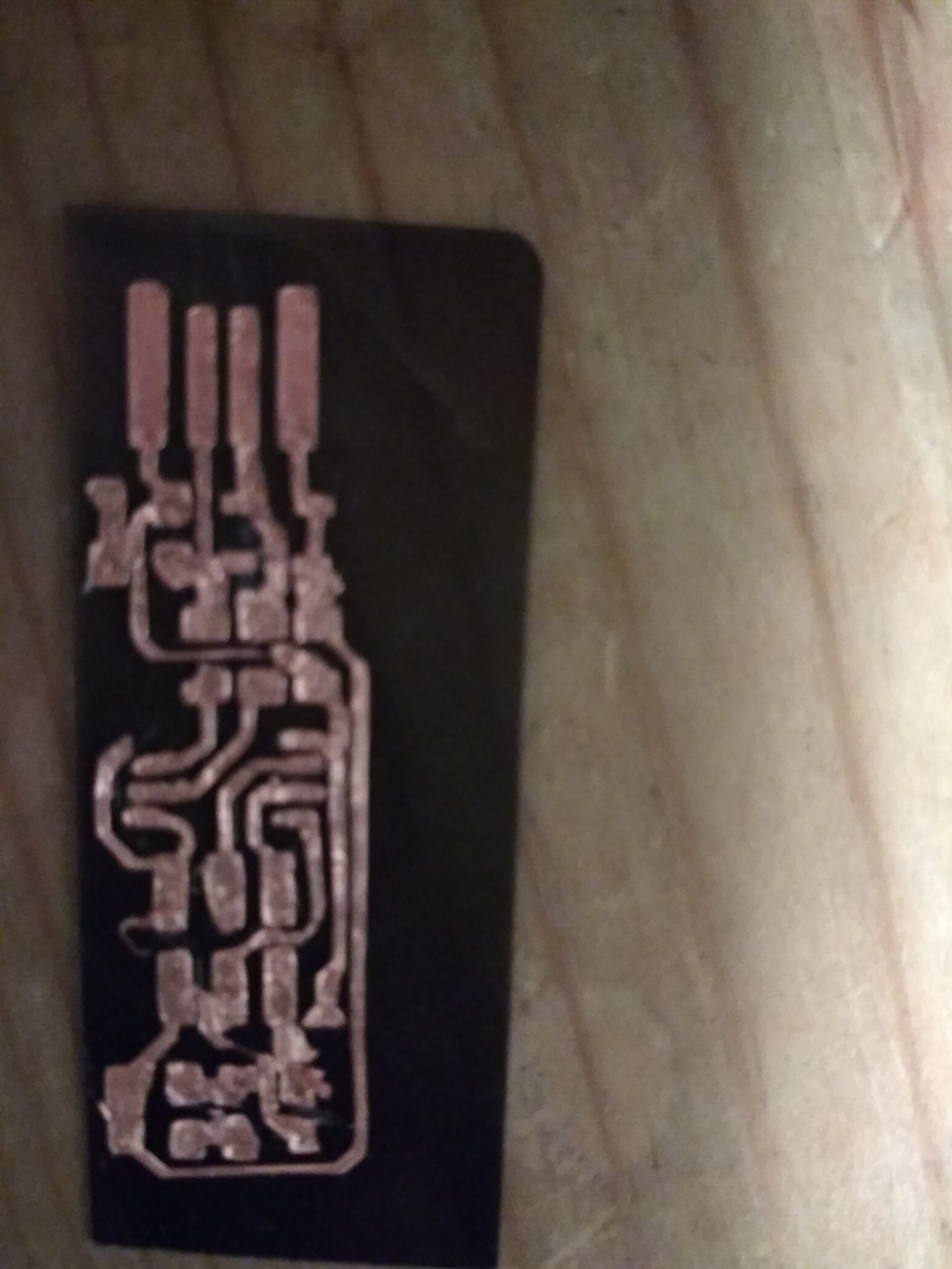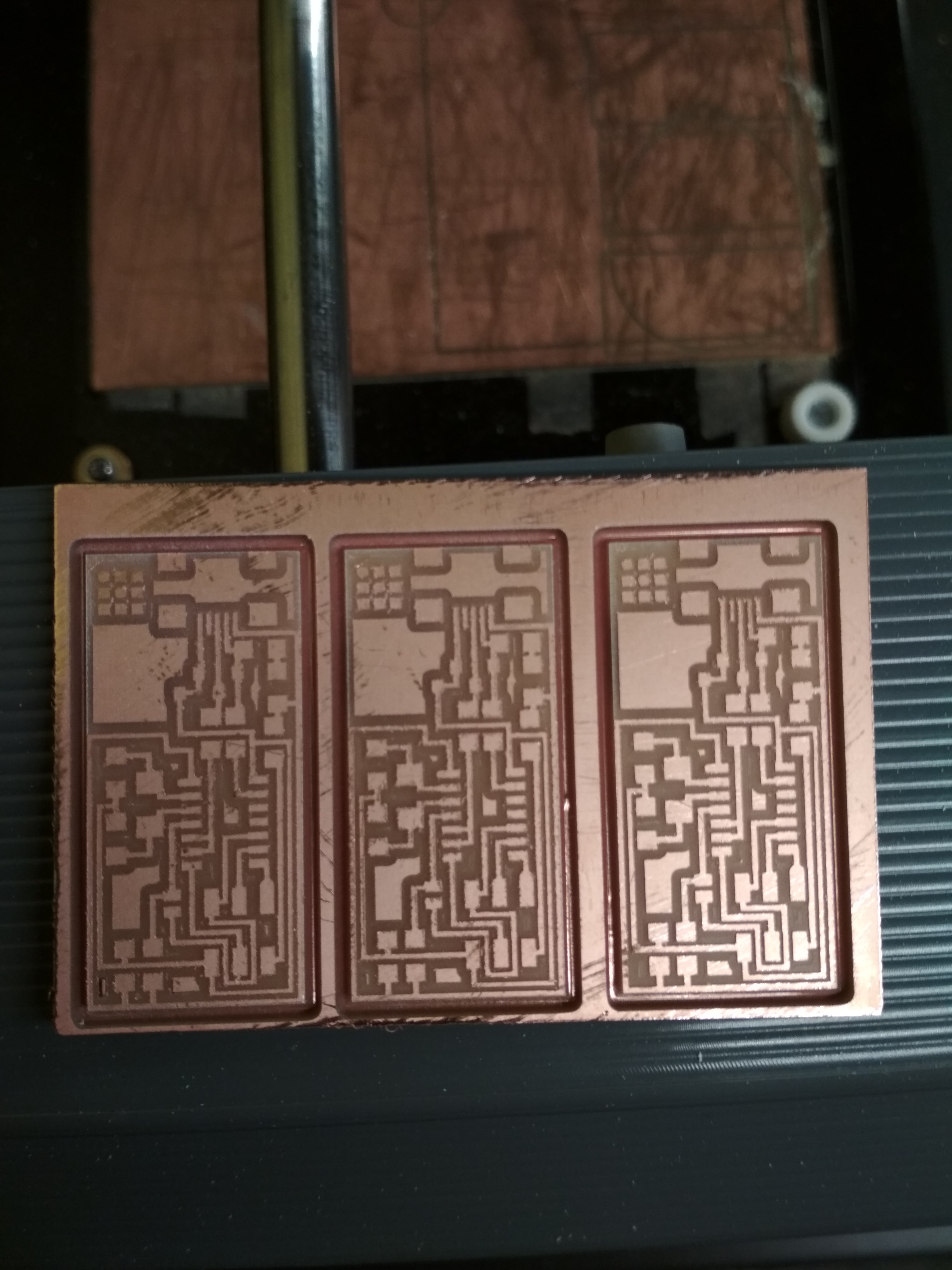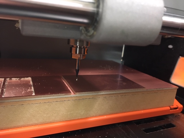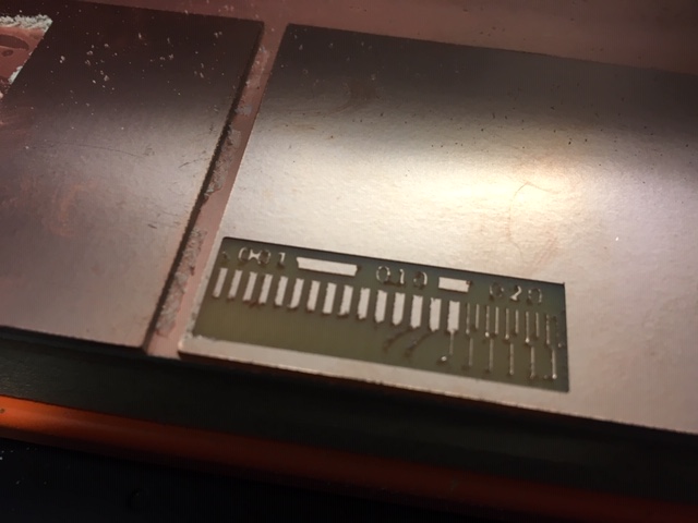 The first time we cut the traces, we chose the wrong end mill, installing the 1/32 for the traces, instead of the 1/64, so this is what’s we got: