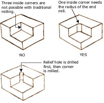 As milling technics consist on a high speed mill removing material from a stock piece, inside corners are a dificult part. It is imposible for a rotating tool to get a 90° corner, so your angles will always have a radius equal to the mills radius. This is reflected on the folowing image: