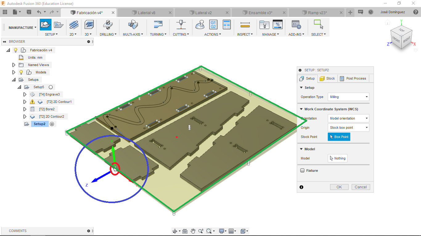 In the following image you can see the Origin (Red), Work Coordinate System (Blue) and Stock (Green) given at the begining of the setup: