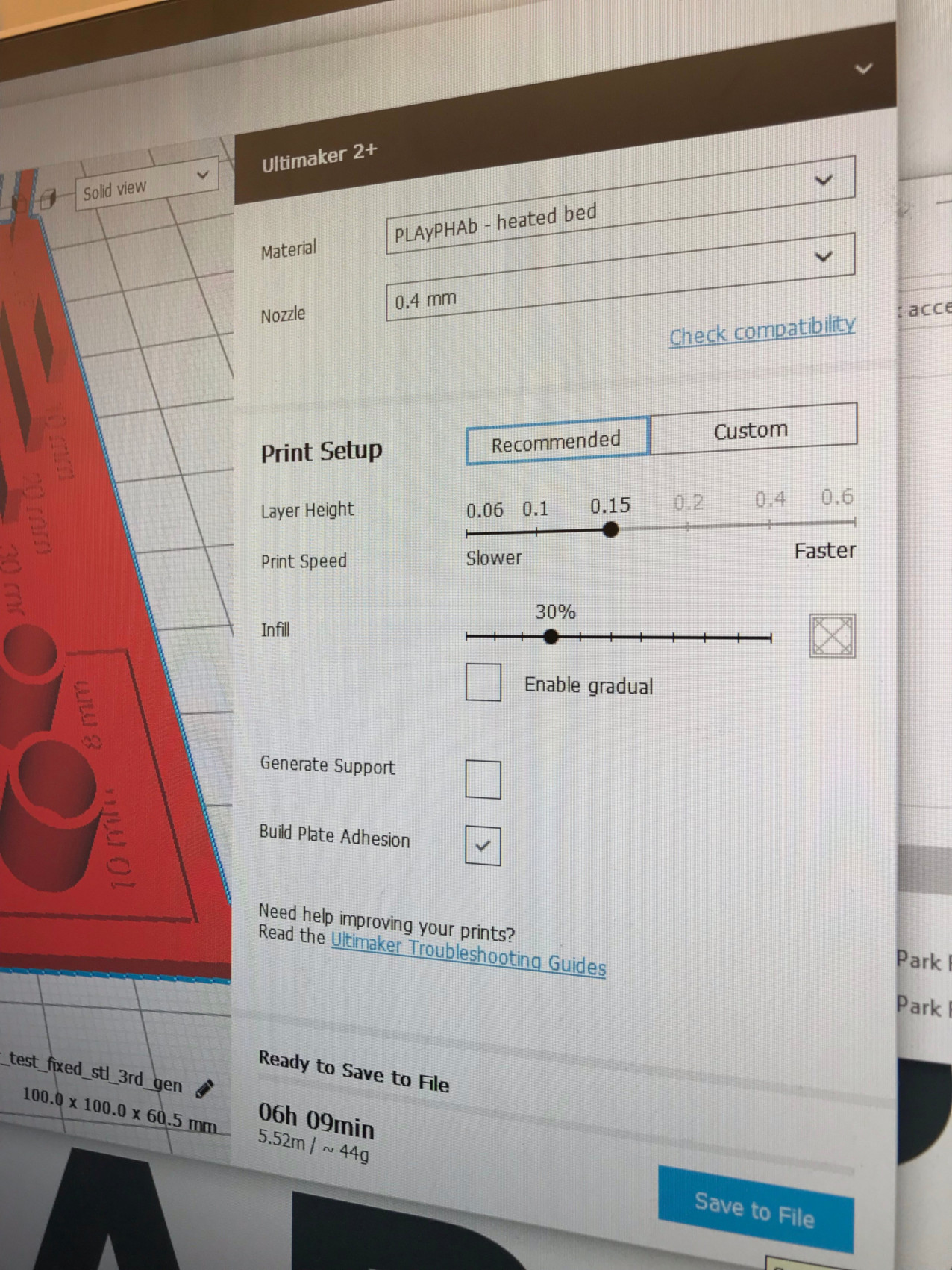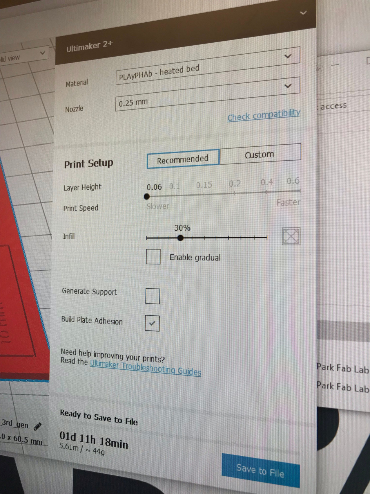 To design this object i have used ‘Cura’ and also to print the object i needed to setup the ultimaker 2+ machine environment One can see evry clearly in this below image that when i set layer height 0.06 slower and infill 30% it was supposed to take 1day 11 Hour and 18 minutes