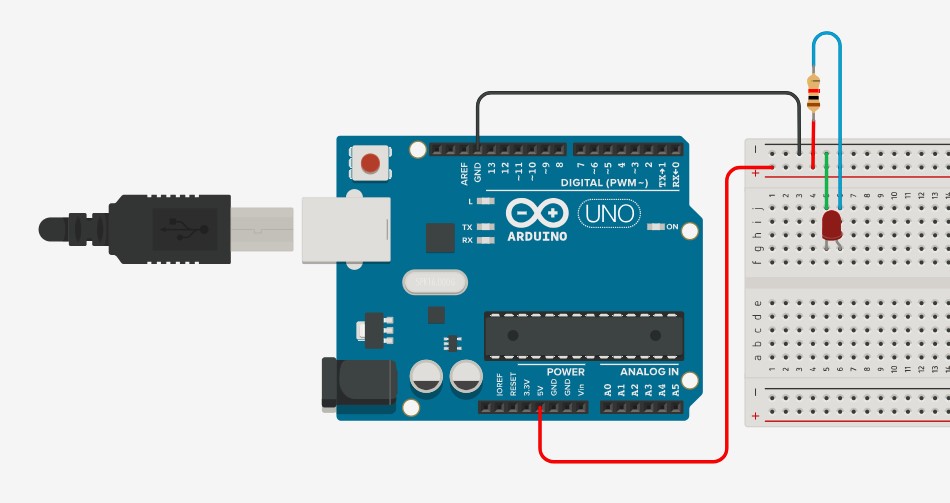 The simplest and most common output device is a led. When connected to 5v, the led will turn on. The resistor is used as a protection for the led. The Led have a polarity and the straight part is the negative and should always be connected to ground, if connected backwards, it will not work. The digital outputs on the Arduino can be controlled by code. Pins 0 to 13 can be controlled by code, so if instead of connecting the red jumper to 5v, you connect it to any of the GPIO, or general perpuse input/output, you can turn the led on or off by code just by declaring the pin as an output using the pinMode(PINNUMBER, OUTPUT); and changing the pinnumber for the correct pin. Then, using the digitalWrite(PINNUMBER, HIGH); or digitalWrite(PINNUMBER, LOW); you can turn it on or off.