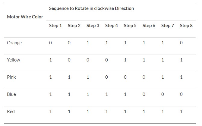 As you can see there are four coils in the motor. One end of each coil is connected to +5V (Red) and the other ends (Orange, Pink, Yellow and Blue) are taken out as wires. The Red wire is always provided with a constant +5V supply and this +5V will energize the coil only if the other end of the coil is connected to ground. A stepper motor can rotate only if the coils are energized (grounded) in a logical sequence. This logical sequence can be programmed using a microcontroller or by designing a digital circuit. The sequence in which each coil should be triggered is shown in the table below. Here “1” represent the coil is held at +5V, since both the ends of coil is at +5V (red and other end) the coil will not be energized. Similarly “0” represents the coil is held to ground, now one end will be +5V and the other one is grounded so the coil will be energized.