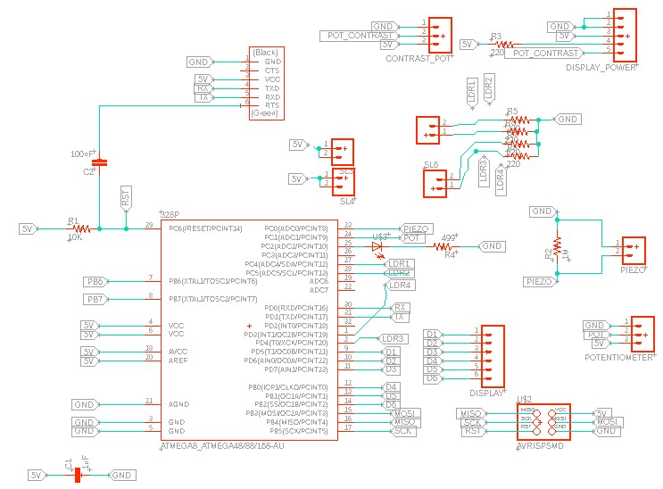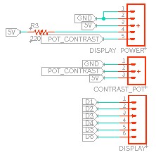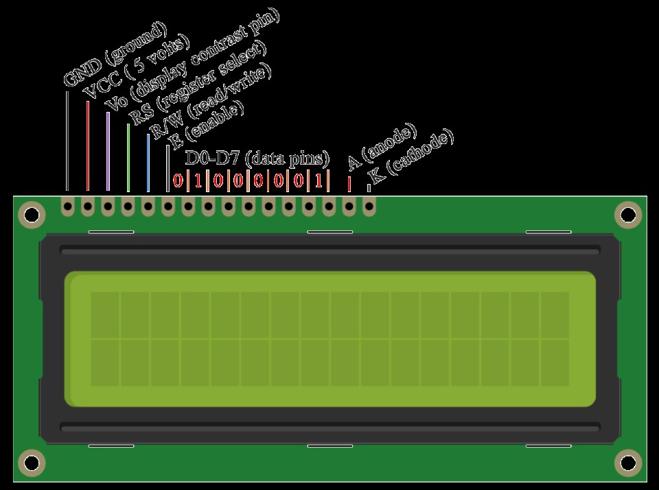 Here, the component used as output are the 16x2 LCD screen. As seen in the following schematic, we need a ground, vcc, potentiometer, and 6 digital outputs.