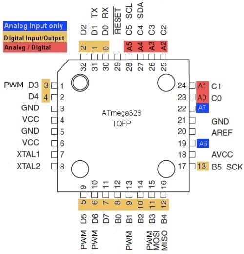 In this board, I will connect my servo as an output, using the pin 24, which is the A1 as seen on the atmega pinout.