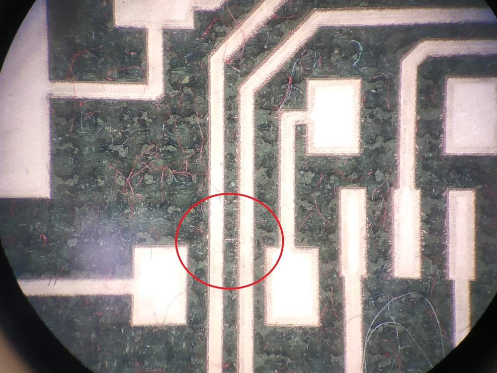 FUN FACT : After making the PCB using the lasercutter, I’ve checked the connections using a multimeter and found there was a bridge between two lines. I checked on the microscope and see this small bridge.