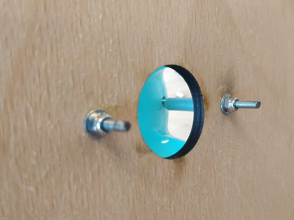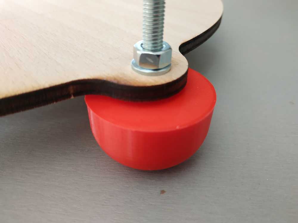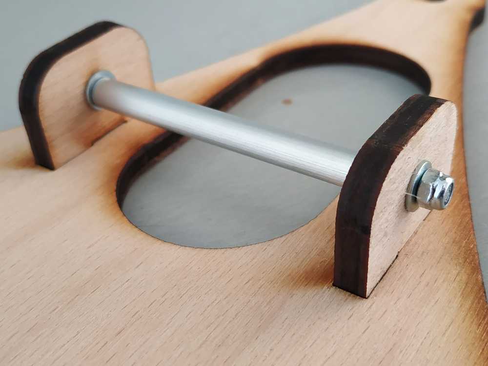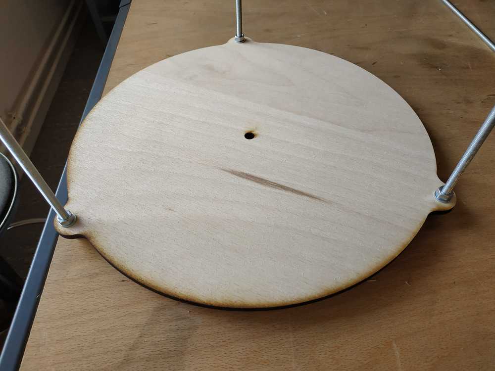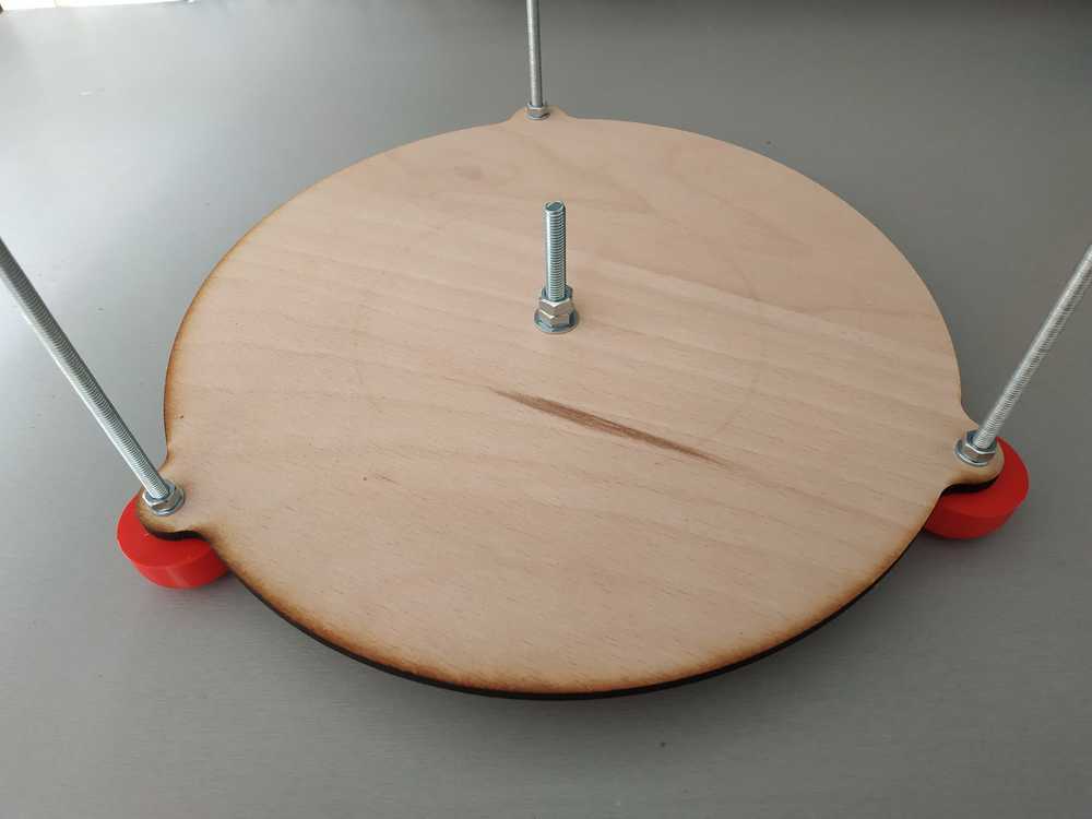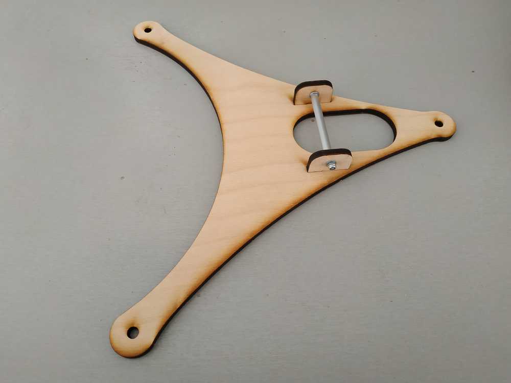 I cut the part in the lasercutter in 5mm plywood using the same parameters as before. Then I mounted the rods (I used 50mm long 6mm threaded rods) with nuts. I put a whasher on each side to protect the wood.