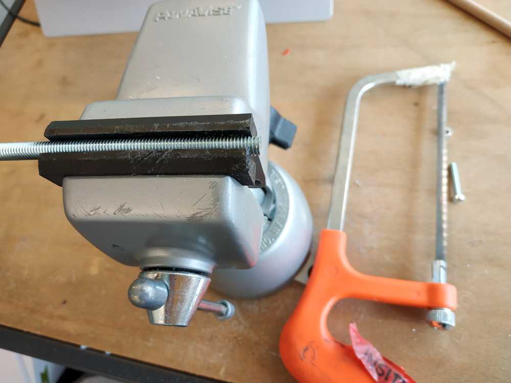 To screw the knitting machine, I removed to screws at the bottom of the machine and replaced it by the two rods. I placed the tube of aluminium around the rods.