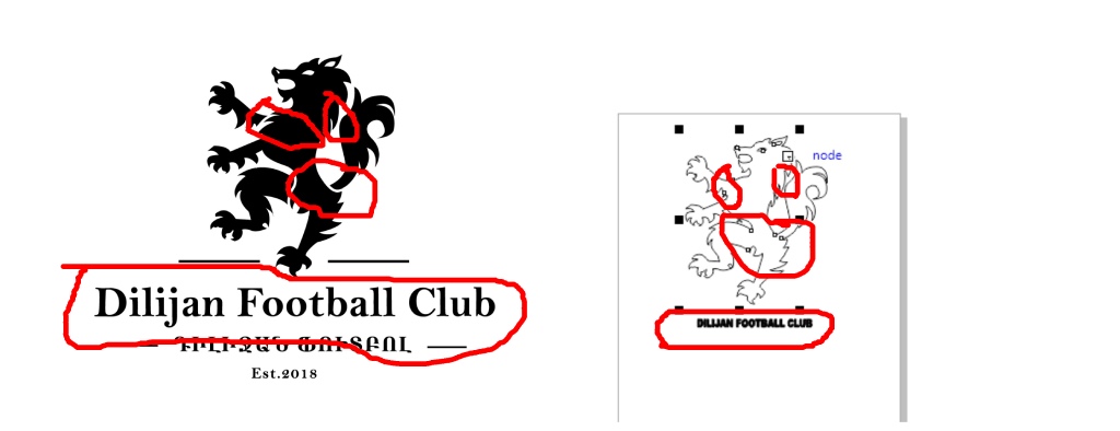 For this assignement I am going use vinyl cutter machine, silk frame, paints, durometor, stick/transfer tape.This week I will make a tshirt for Dilijan football club. Our Fab lab is located in Dilijan, there are different projects, which should develope some fields in this city. One of this prjects is Fab lab, Dilijan football club (DFC), MAID center etc. All these projects callaborate with each other. Some of our friends are involed in DFC and we were discussing to make tshirts for the team by ourselves. At that time I suggested to make Tshirt and I will do my assignement too. So I asked them to give me logo and a sample of their tshirts. They didn't have Vectro file of a logo, they had only .png format file. I told, that I will draw it by myself and make some changes. In this picture you can see the difference, I indicated it by red circuls. You will see spaces, different angles, other font...
