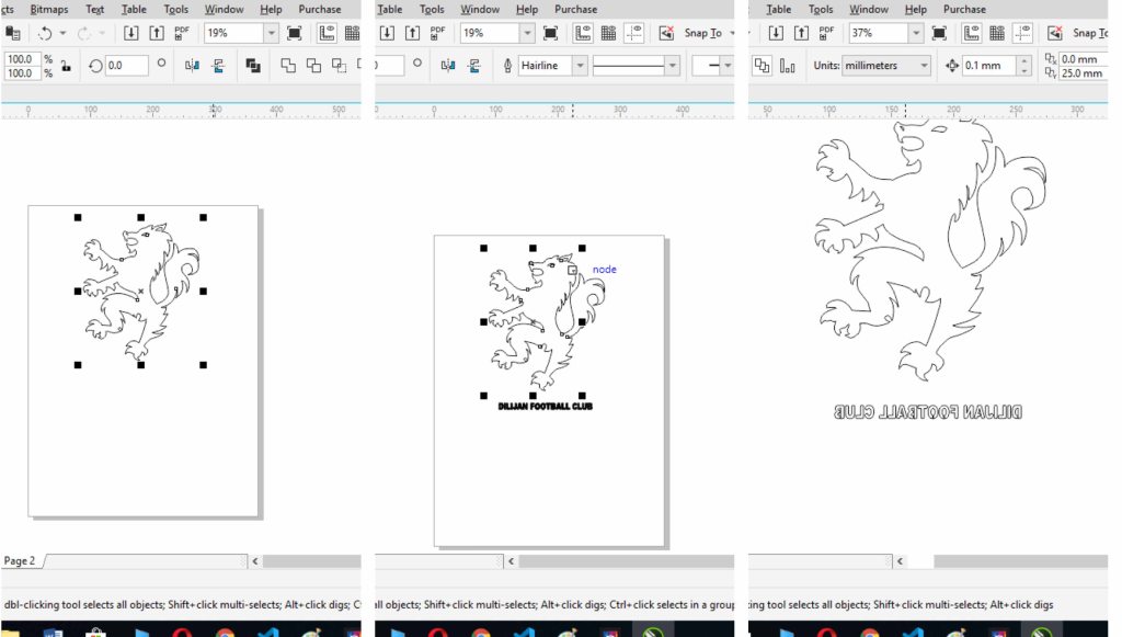 I improved all that by "Shape tool". After all these I wrote the text by "A text" tool. I used "Vinyl cut bold" font and wrote "Dilijan Football Club". For vinyl cutting we need to outline all objects we want to cut. That is why I used "interactive fill tool" removed fill, select "outline pen" tool, chose "width" "hairline" and my text was outlined. After I mirrored the text for printing the tshirt. After I make "hairline" all lines of the lion, as I mentioned before we needed it for vinyl cutting.