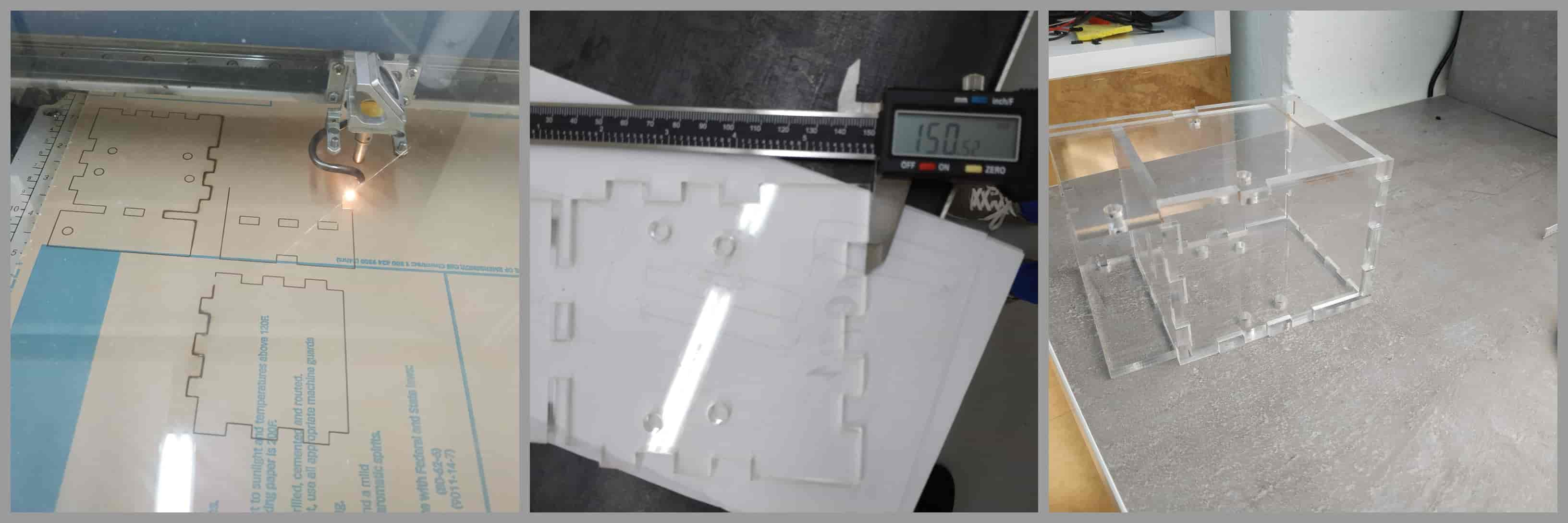 During the cutting process the coated paper of the plexiglass burned, I recommend remove it before cutting. After cutting the boxes I checked the sizes and started construct them, but for getting final result I still needed 3D printed parts of my boxes. During future weeks I will make the missing parts.