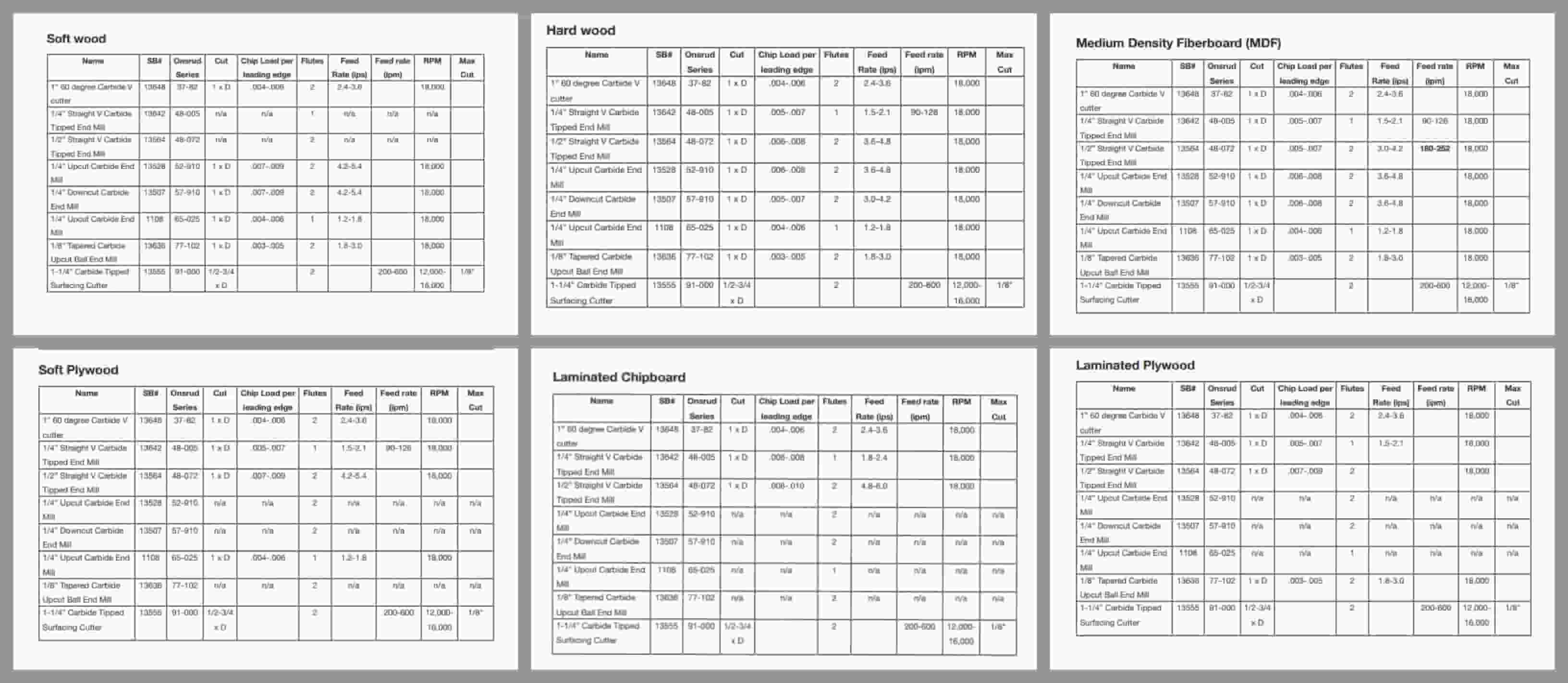 >These charts have been taken from Onsrud’s recommendations and calculated in order to save time for the bits provided in the ShopBot bit kit. For further information, Onsrud series numbers are provided. ShopBot numbers are also provided for an easier, streamlined ordering experience. Onsrud provided numbers are cut depths, chip loads, and flutes. The exception to this rule is the “Carbide Tipped Surfacing Cutter” which has all values provided by Onsrud. Any tools with no values provided are not listed by Onsrud, but if they are contacted about a specific use, they may provide some base numbers from which to calculate.