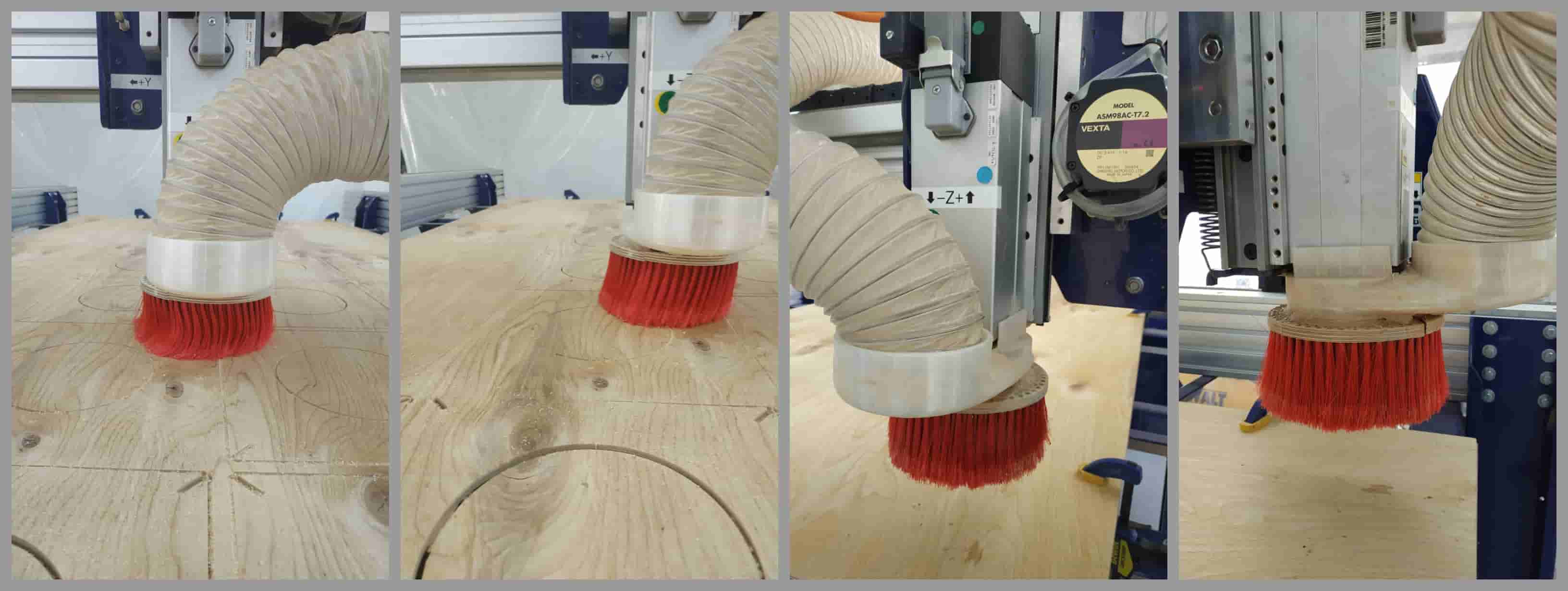 • Starting: Loaded the tool path file into the shop bot software and and clicked start. Read and entered the prompts about zero-ing. When the final prompt to start the spindle appears, I attached the shroud around the router and turned on the dust collection system. Started the spindle before clicking ok. When it finished its work and came the time for the next bit, the shop stopped and asked if the next bit was in place. Changed the bit and pressed ok on the prompt. Then I repeated the "z" zero process using the plate. Moved the gantry over the piece when prompted to and zero the "z" plate. Repeated below mentioned activities.