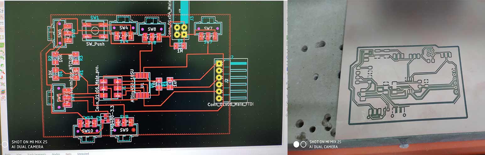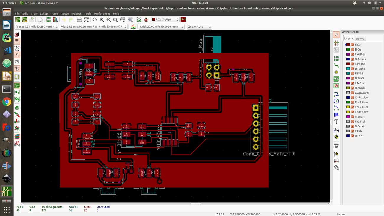 This week was a very interesting week, I have designed my board and make it work as I want. I have also learned how to program the board using terminal commands. I have got some problem regarding the PCB ground. Because I what to make it one layer board, but I find a solution by adding jumpers to connect ground everywhere. Also, I have problems with opening python programs. Button program works well but others are not, in any case, the button program receives the signal from the board. It means the board works good, the only problem is that my computer was not opening other python programs, but I will solve it.