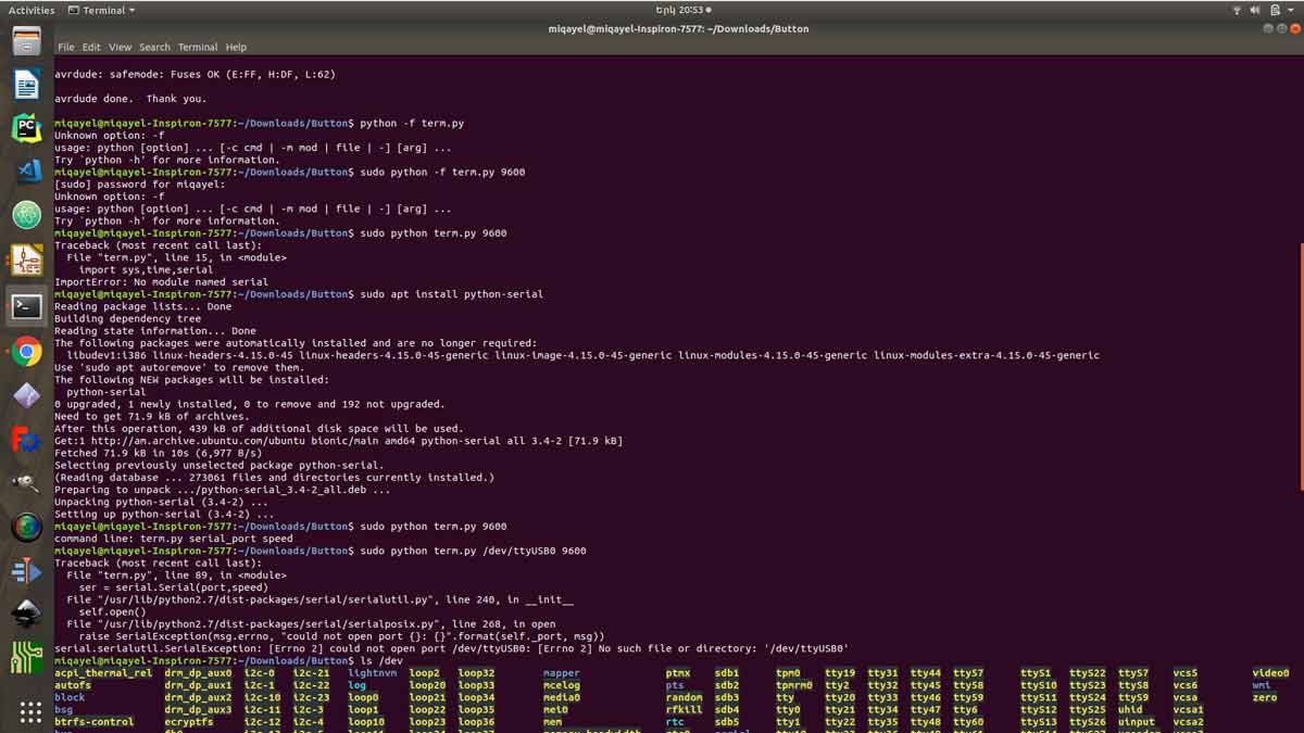 The next step is to run make file by writing make -f hello.button.45.make program-usbtiny it will program your board after run .hex file by writing avrdude -p t45 -P usb -c usbtiny -U flash:w:hello.button.45.c.hex and finally run your python program by writing sudo python term.py /dev/ttyUSB0 9600 (but before check which name your FTDI cable has by writing ls /dev). With the help of the python program, you will get all information from your board. In my case, I need to program each time if I what to use a certain sensor on my board. Here I have only push button code but it will work for any other program, just download files from the site and run it.
