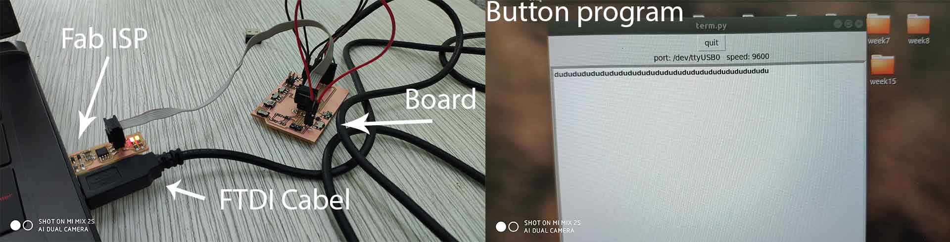 For programming, I used Neils Code and FabISP as a programmer. For reading the information I used FTDI cable. Before running the code make sure that you have installed “AVR dude”, connected FTDI cable to the board and the computer.You can check connection by writing on the teminalusb /dev and you should find ttyUSB0(it means your FTDI cable is connected to the computer).